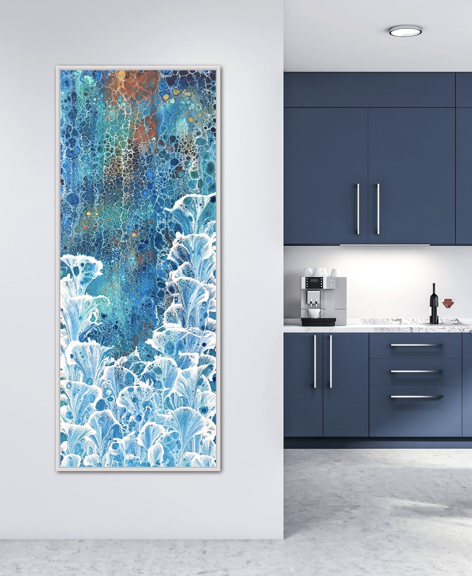 Spring Valley is inspired by nature and depicts in abstract white Lilies growing tall and in abundance with a lush valley full of colourful flora behind. Created using various techniques combined to allow increased flow, interaction and separation of colours to create interesting patterns where pops of colour can be seen emerging from underneath. This added dimension adds lace and cells to the artwork creating an interesting and one of a kind painting that can never be replicated.