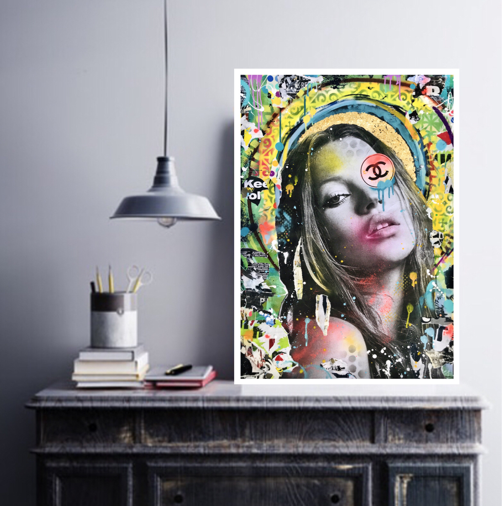 The main vintage image of Kate Moss was then added, then overlaid further with paint and paper to give a worn rustic appearance, a look you would see created over time in the laneways of Melbourne. Late was given a Gold Leaf halo, juxtaposing the recycled materials.