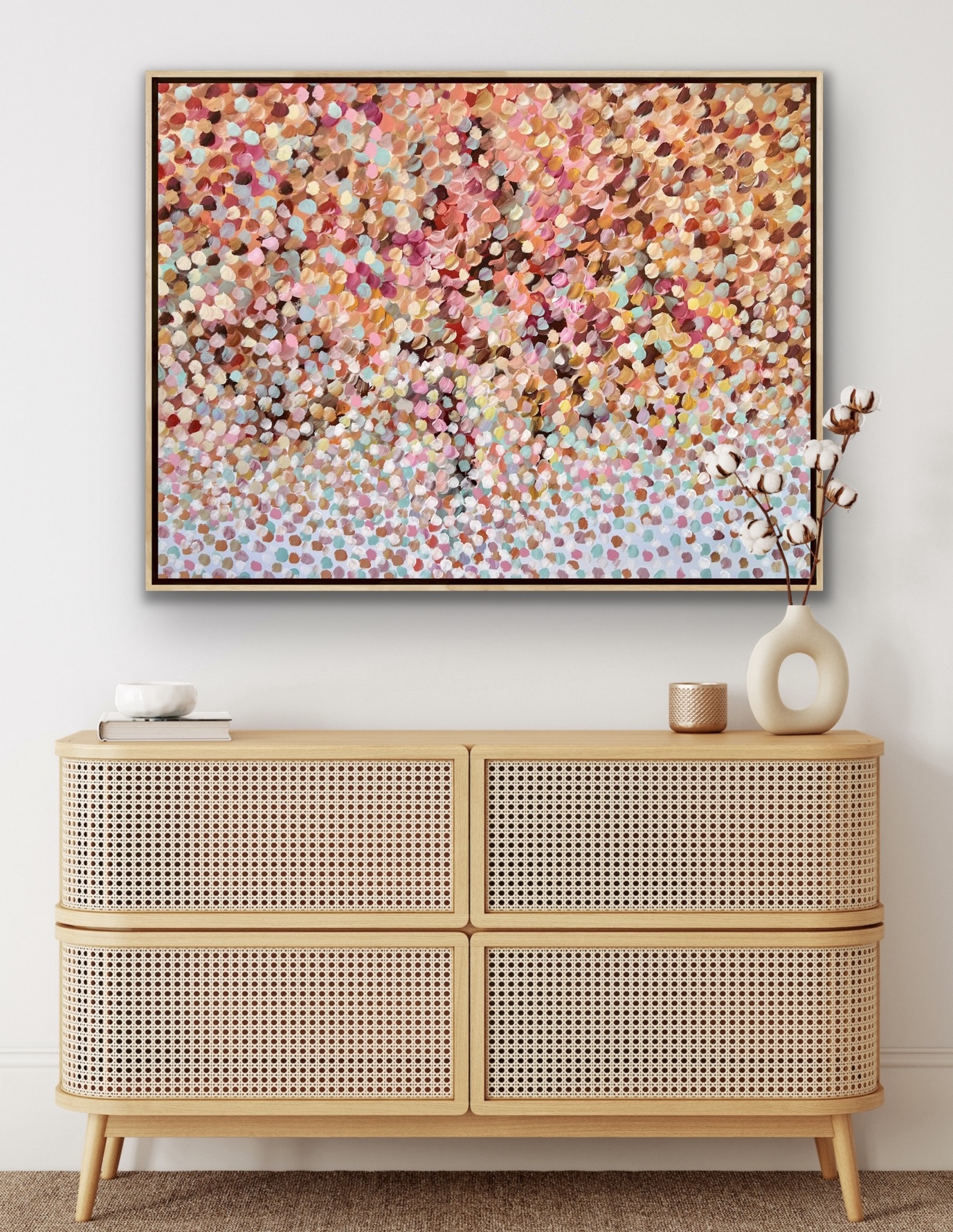 Sprinkle some Love by Theo Papathomas a painting with lots of layers of beautiful warm and cool colours of petals weeping over the field. The landscape becomes a bouquet of petals dancing over the land. I tried to create this beautiful composition of playful colours of the landscape of flowers and petals making a beautiful field of memories . Capturing the beautiful colours of the petals, like musical notes dancing over the landscape, painted in acrylics. The field comes to life with the sounds of the petals creating movement and rhythm. The painting does not come with an external frame.The painting is signed and dated at the back and comes with a certificate of Authenticity.