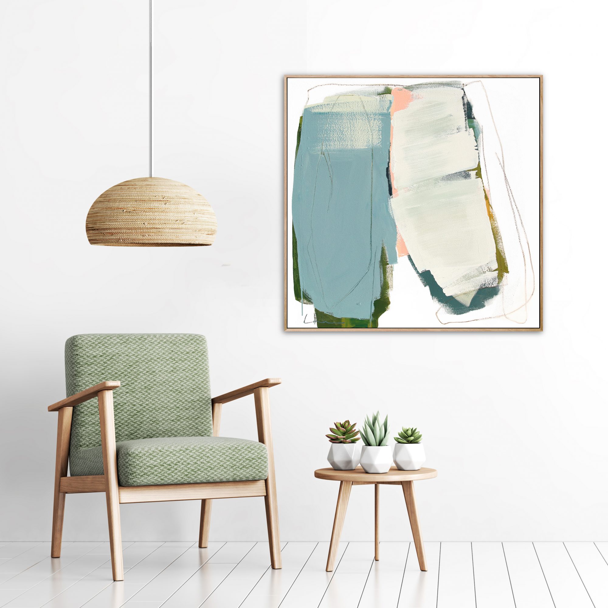 Spry is very textured and is a combination of blues, greys and greens with a touch of apricot. The painting extends around the 3.8cm sides of the canvas so it’s ready to hang. An oak floating frame (as per images) can be included for an additional $280.