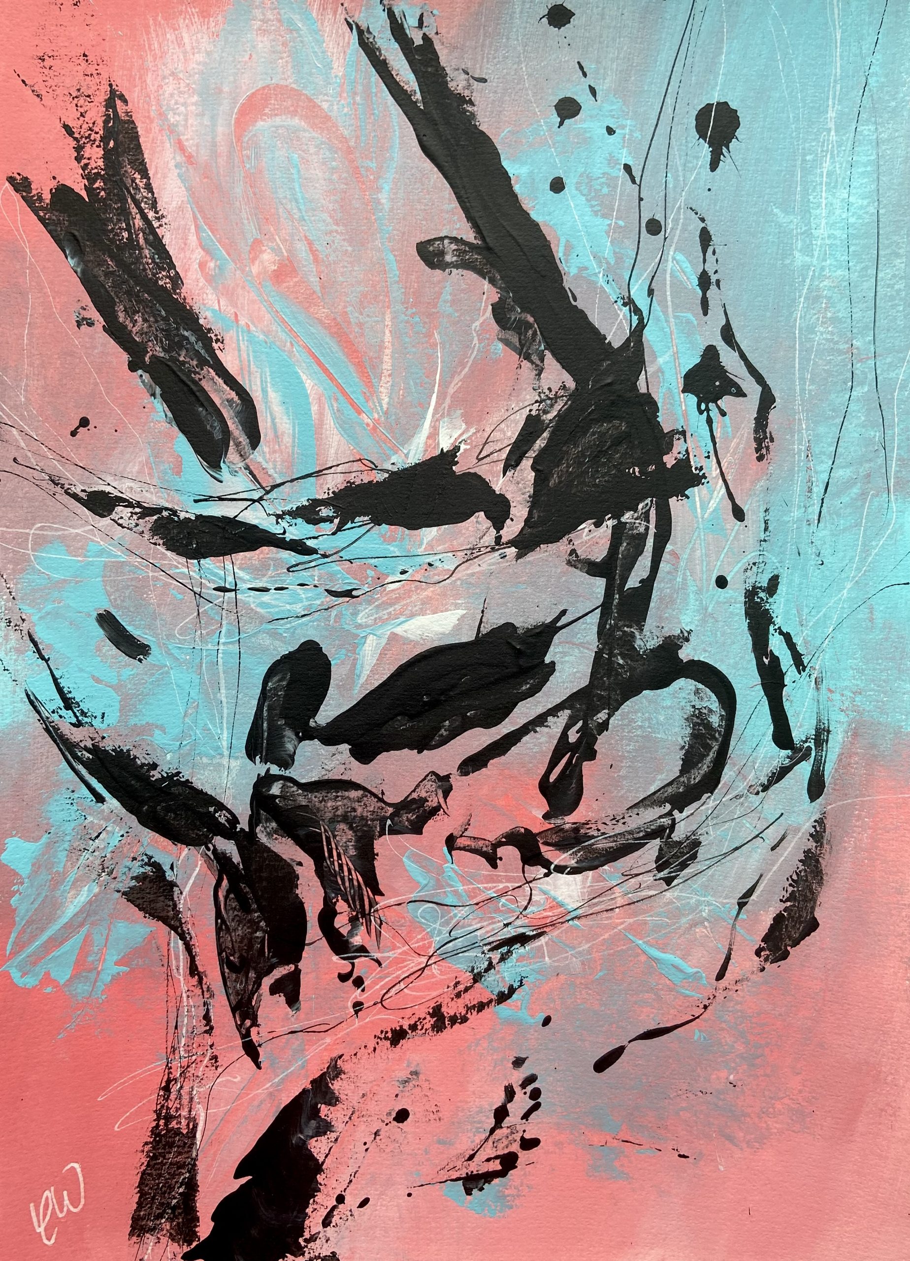 A striking abstract painting full of lively energy and expression. Some images show what this piece looks like framed. Frames not included. 29.7 x 42 cm (A3 size) Acrylic on paper. Requires framing.