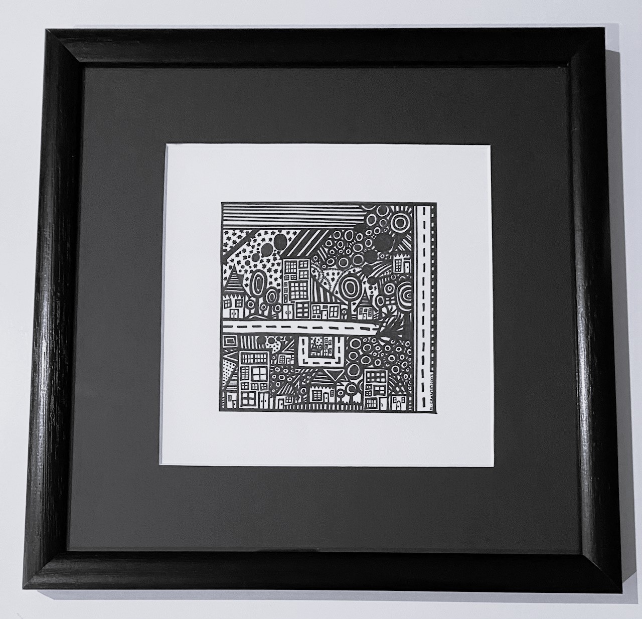 Squares Road by Misty-Spring Grant – Framed original black and white archival ink drawing.