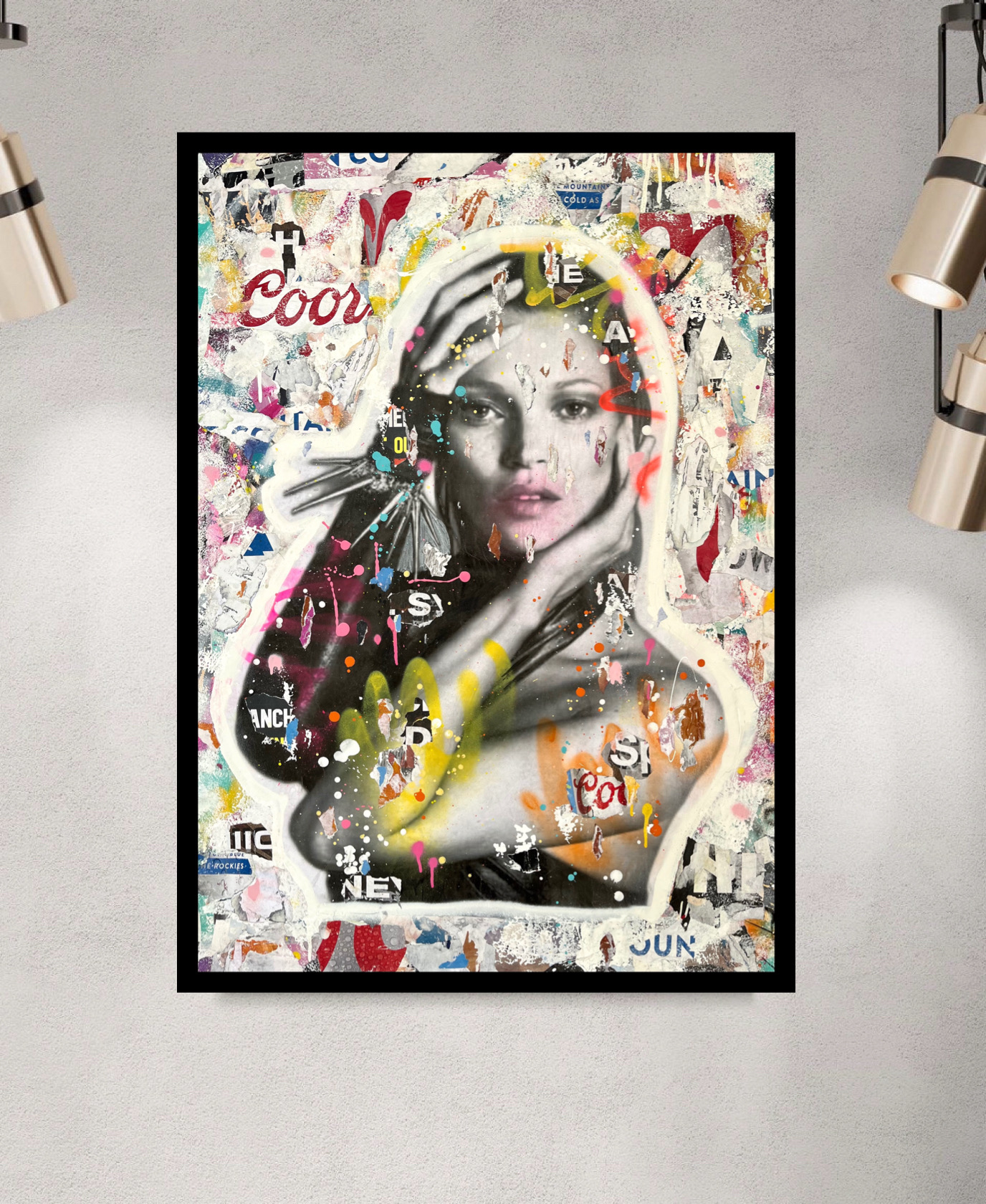 The main Image of Fashion Icon Kate Moss was added and then further overlaid with lots of layers of paint and street posters to give a worn rustic appearance.