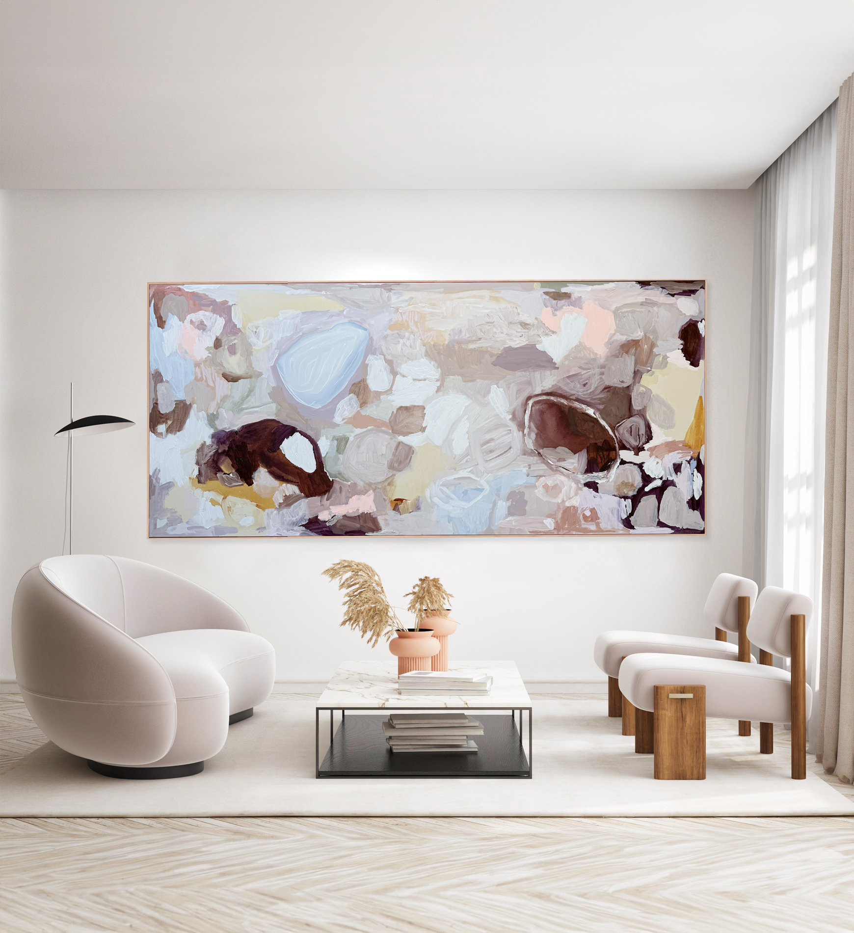 A statement artwork to conjure emotions and feelings based on the colours, shapes and forms within the piece. A softly coloured abstraction of Australian beaches, the iconic dunes and the surrounding nature.