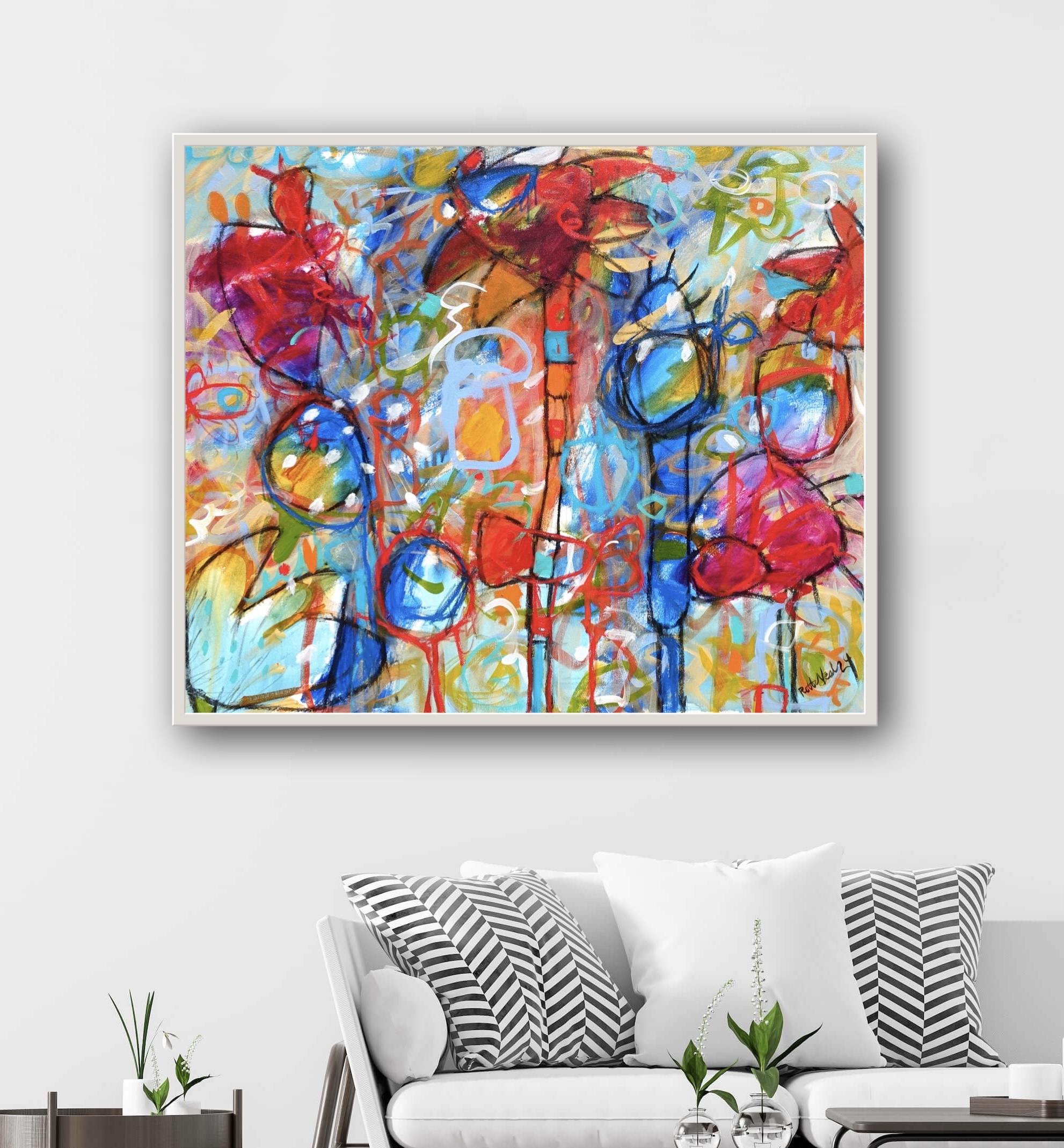 This work is sent without an exterior frame (images are to give an idea of what it would look like with an exterior frame).