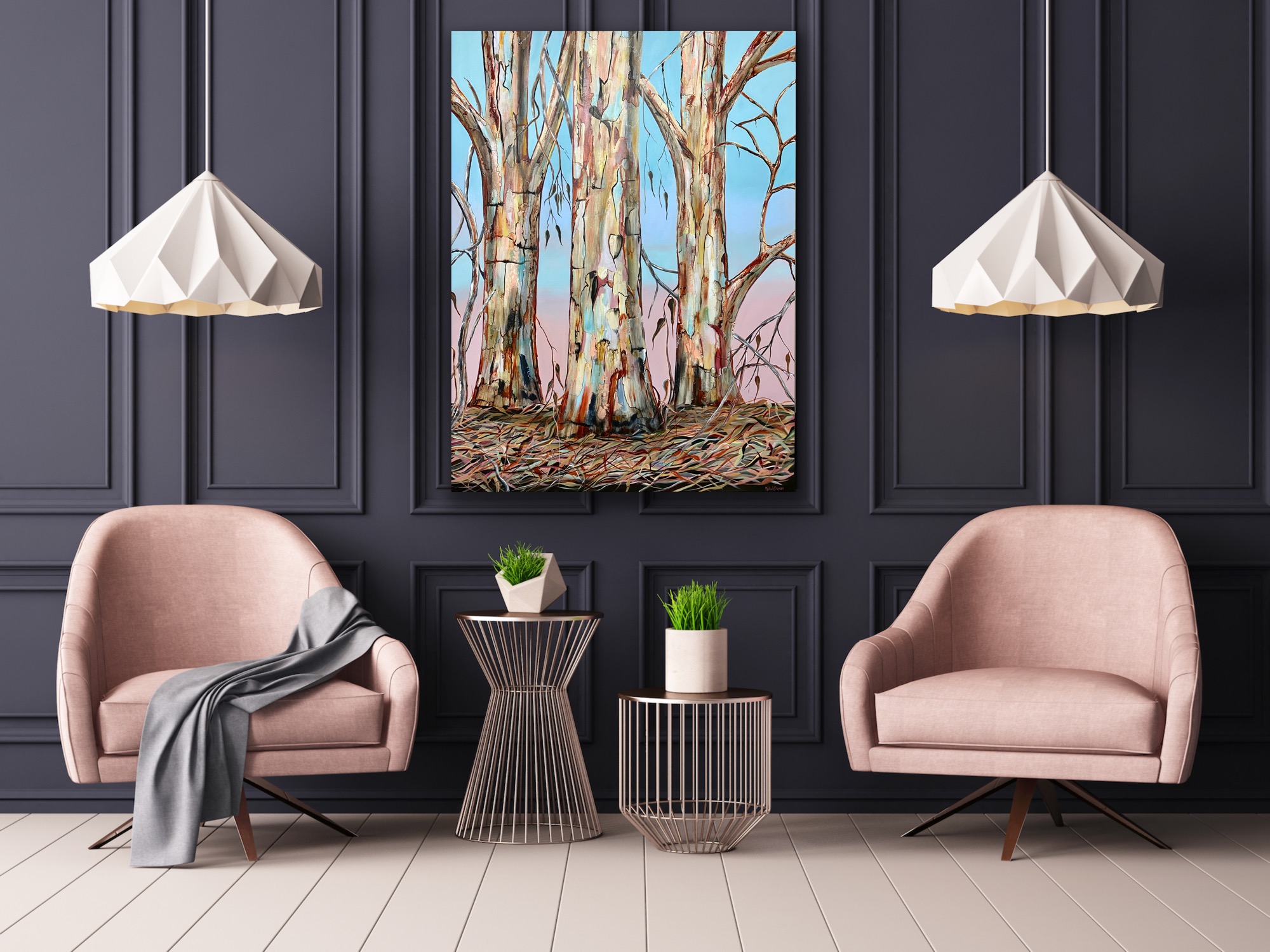 ’Standing Tall’ by Julie Dynan an original acrylic artwork which has colourful bark with lots of detail, gum leaves on branches with dried leaves and twigs on the forest floor.