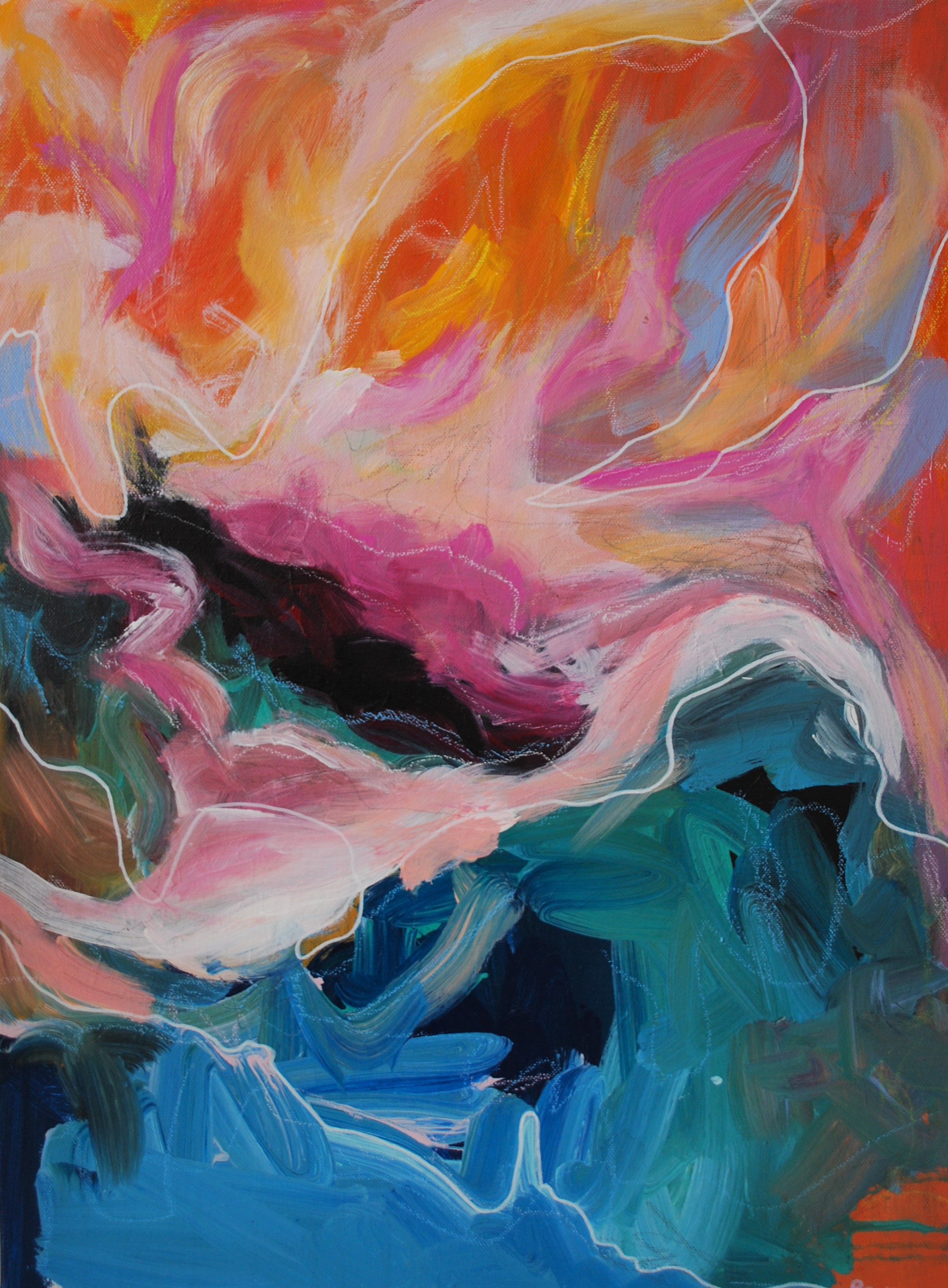 Staring at the Sun – This work is part of my exploration of a process driven art practice with emphasis on play and experimentation. I work mainly in acrylic and a variety of mixed media (oil pastels, pencil, graphite, makers) on canvas and paper. Using a dynamic process of layering, marking making, texture and colour, I strive to be fluid and spontaneous in my work.