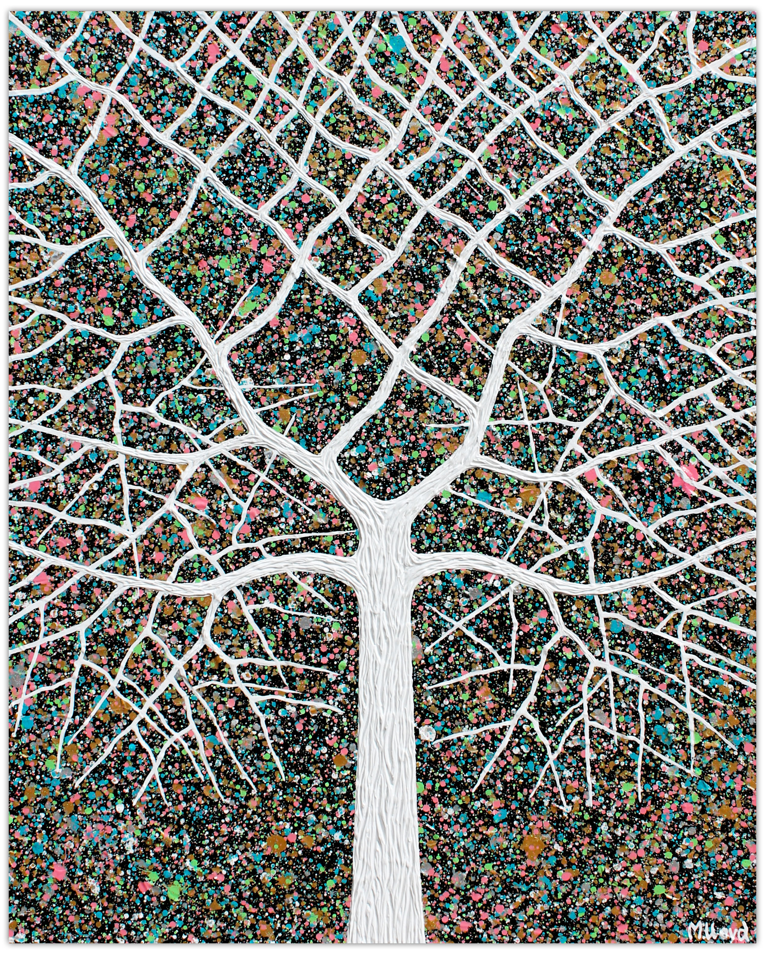 Starry Night Tree Portrait – My signature style tree in starry blacks, blues, greens, pinks, white, metallic gold and silver. A dramatic contemporary piece of traditional blacks and whites but with bright specks of colour. Heavy textures both in the background and the tree itself. A real show stopper.