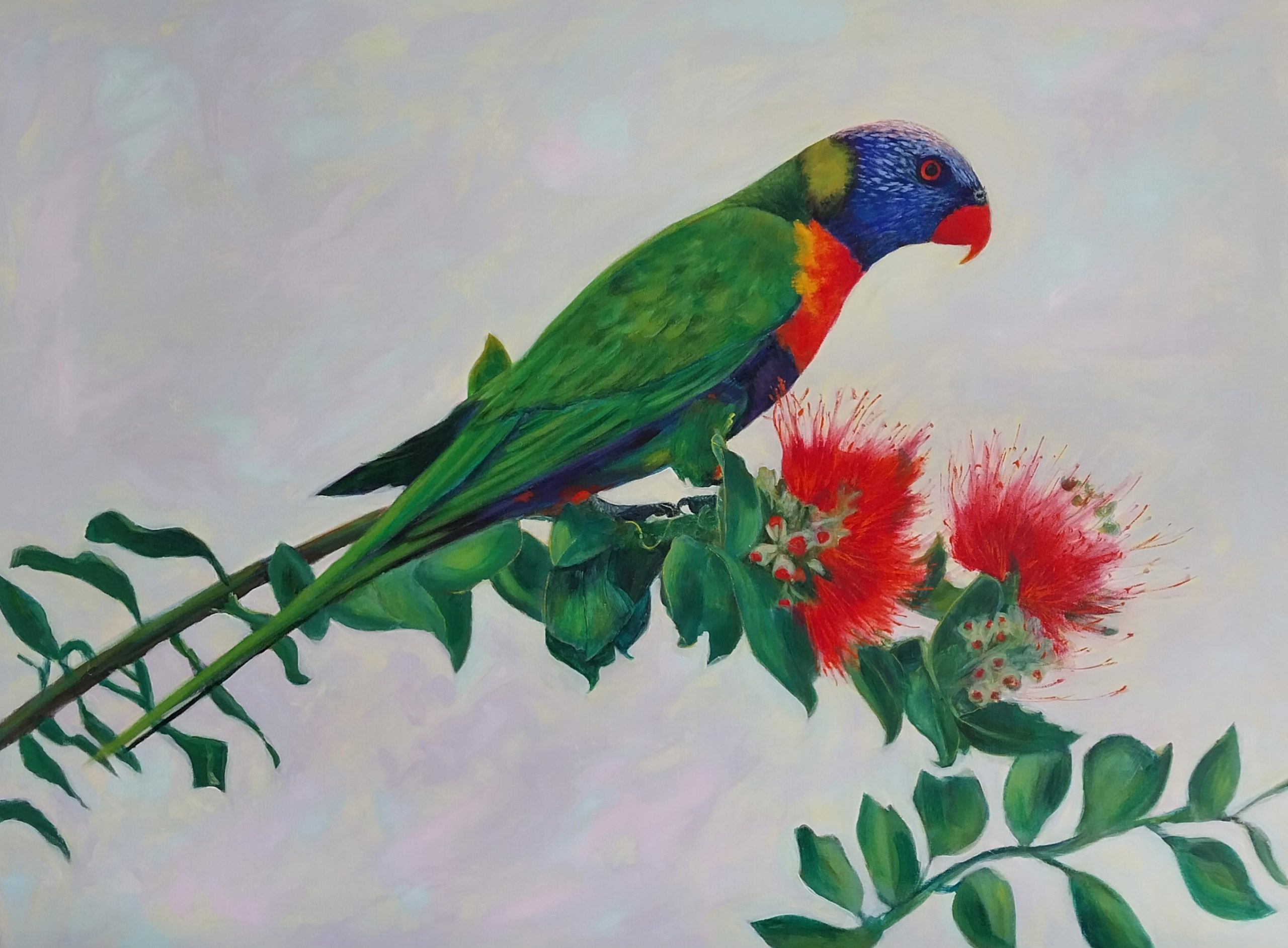 Statuesque by Millie Simic – Our grevilleas are covered in flowers at the moment and our local Rainbow Lorikeets love them. Always a beautiful subject to paint. The painting’s stunning vibrant colours are a statement in any room and something to make you happy. The background is painted in pastel lilac, yellow and blue, hard to see online but really makes the subject matter stand out and is extremely peaceful to view.