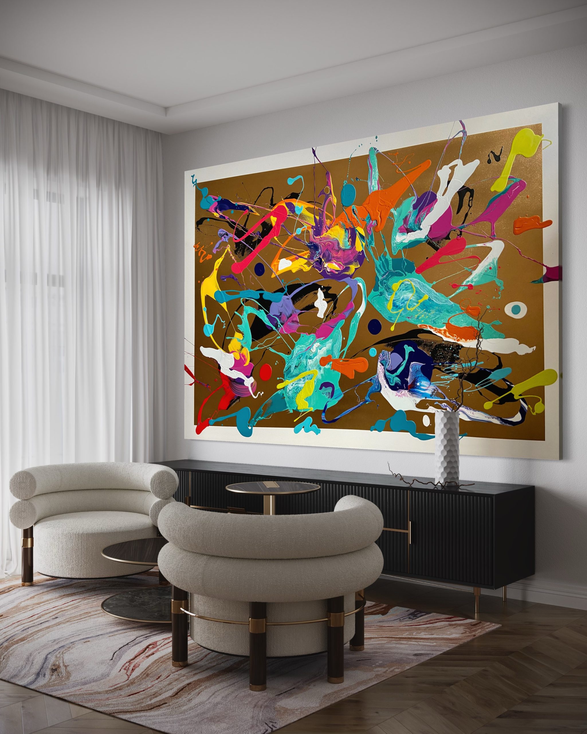 Another edition from my popular collection “Narratives” a series of paintings that are carefully arranged by showcasing organic shapes that orchestrate a narrative of conflict and harmony, fragments of contrasting colours created through blending brushstrokes, abstract signatures and sculptural like curves.