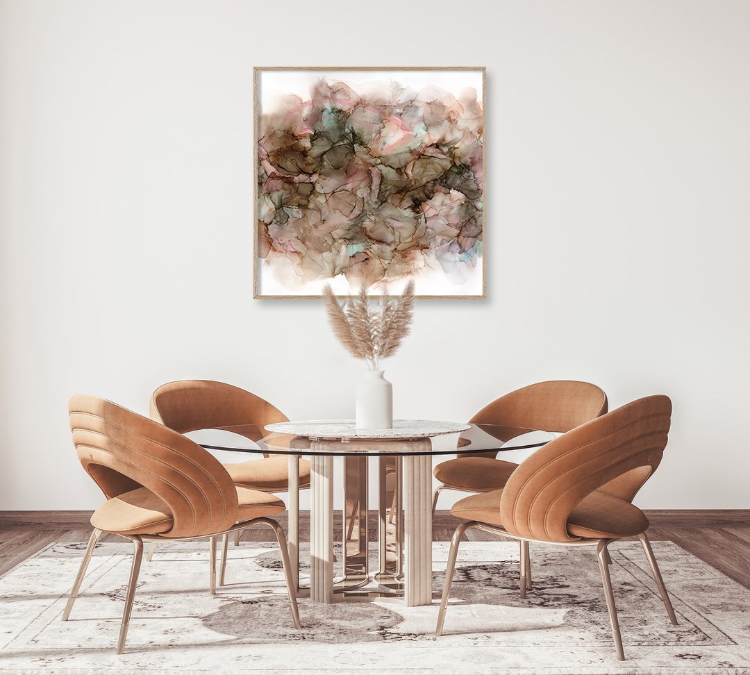 A framed original artwork created with a calming and soft arrangement of colour across the page. The artwork features beautiful brassy gold highlighting throughout.