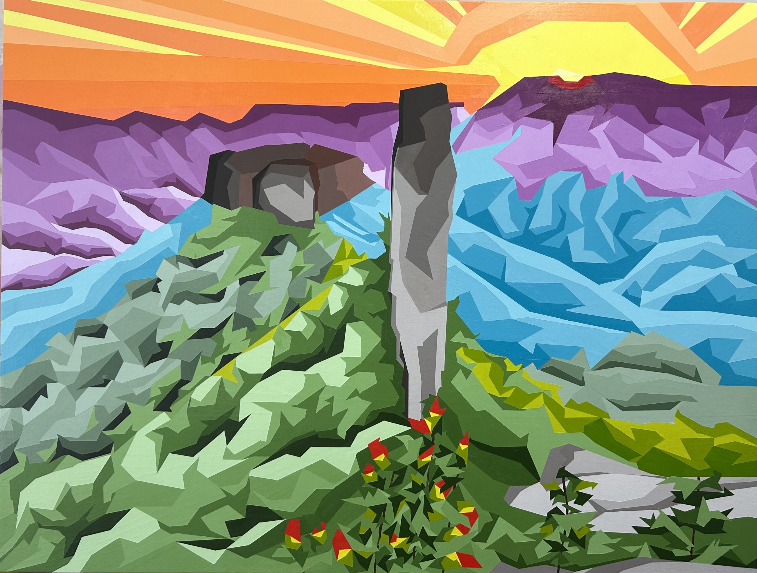With a love of organic forms in nature this artwork is a fractured abstract landscape. Representing Australia’s incredible sunset across Main Range Queensland towards Steamers pinnacle in 2023. The setting sky throwing hues of blues and purples over the green shadowed bushland. Movement and form is depicted by directional fragmentation. Suggestions of shadow and construct of our incredible landscape.