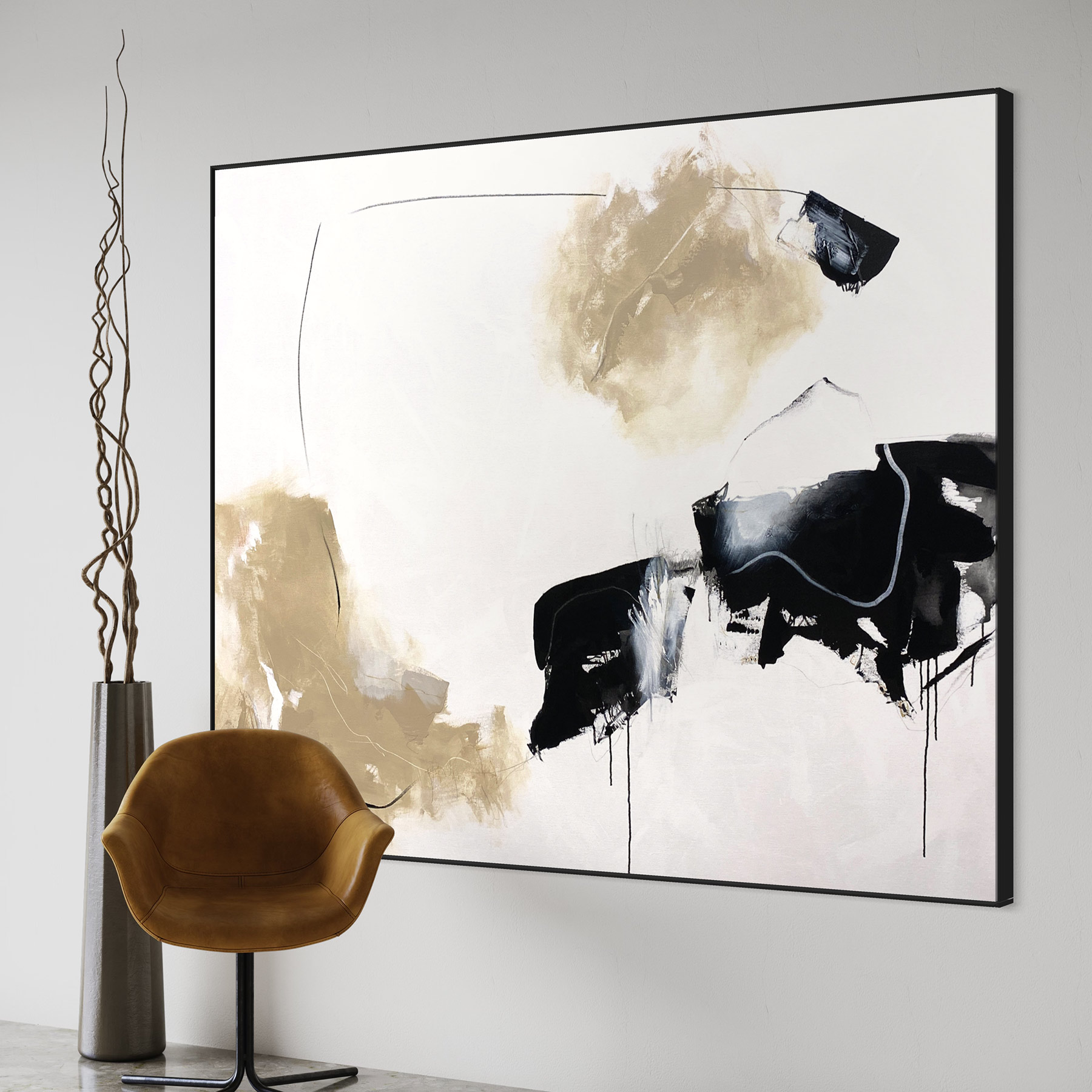 Steely Waters is a beautiful statement painting perfect for the home or office. Its bold palette of warm beige, against grey, black and white will come alive in any space as the black seems to move in changing light.