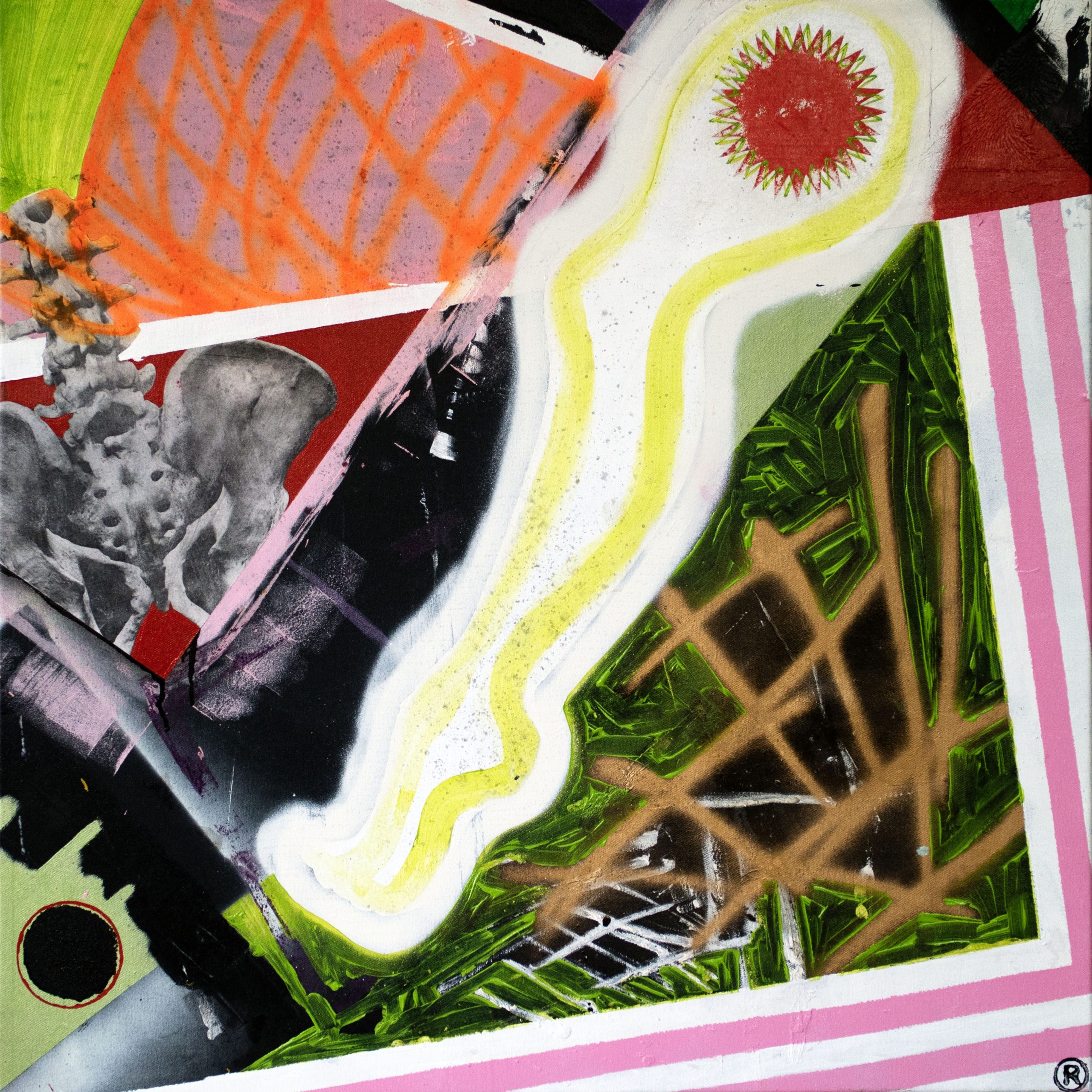 Step Right Up by Rehgan De Mather  Mixed media – acrylic spray paint oil stick charcoal chalk and collage on canvas.