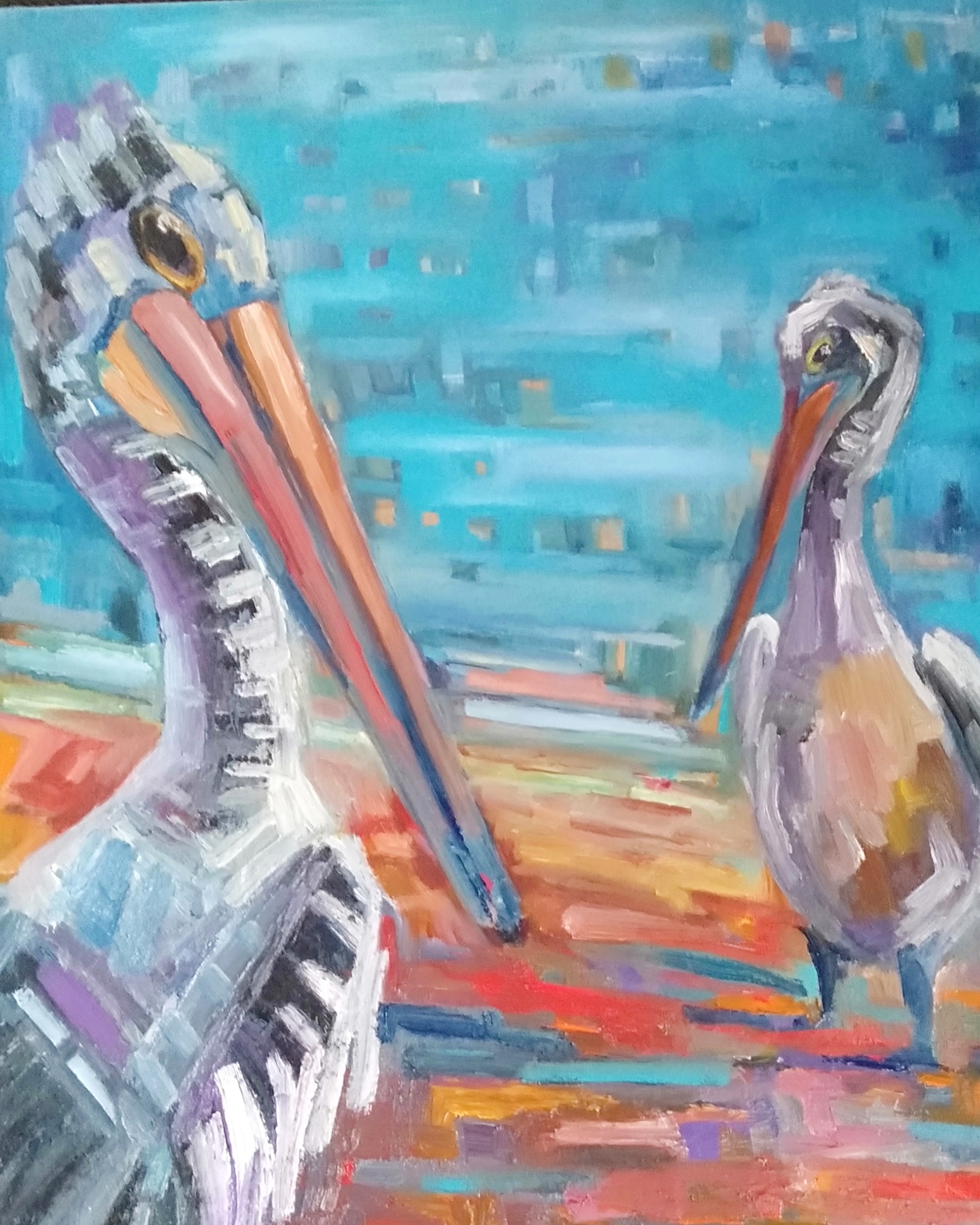 Sticky beak moments by Angela mulligan. original artwork.expressive art.two pelicans meeting up on the shore line .a palette of subtle tones selected to capture the mood of the day.