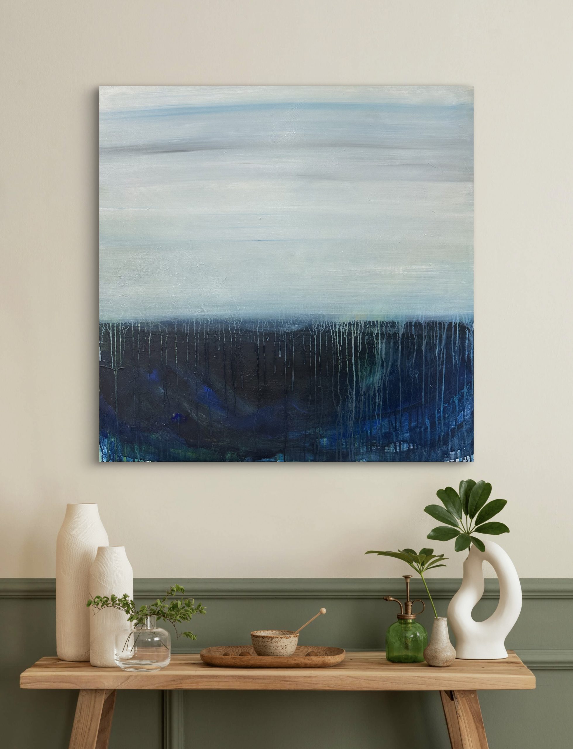 A serene abstract in shades of blue and grey. The sides are painted black so framing is optional.