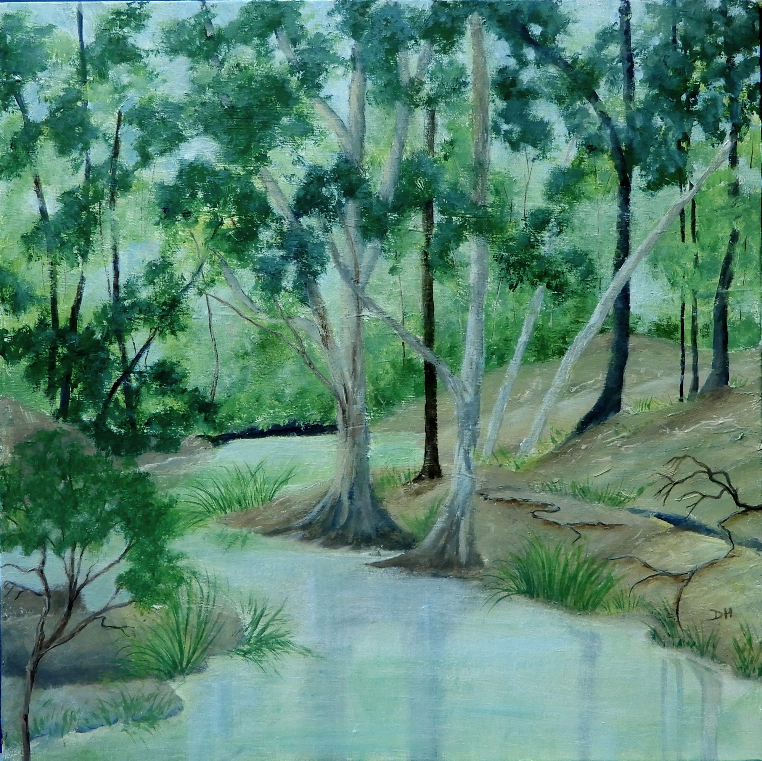 This peaceful impressionist painting is inspired by the many beautiful creeks fringed with graceful eucalypts around the Fosterton area in NSW.