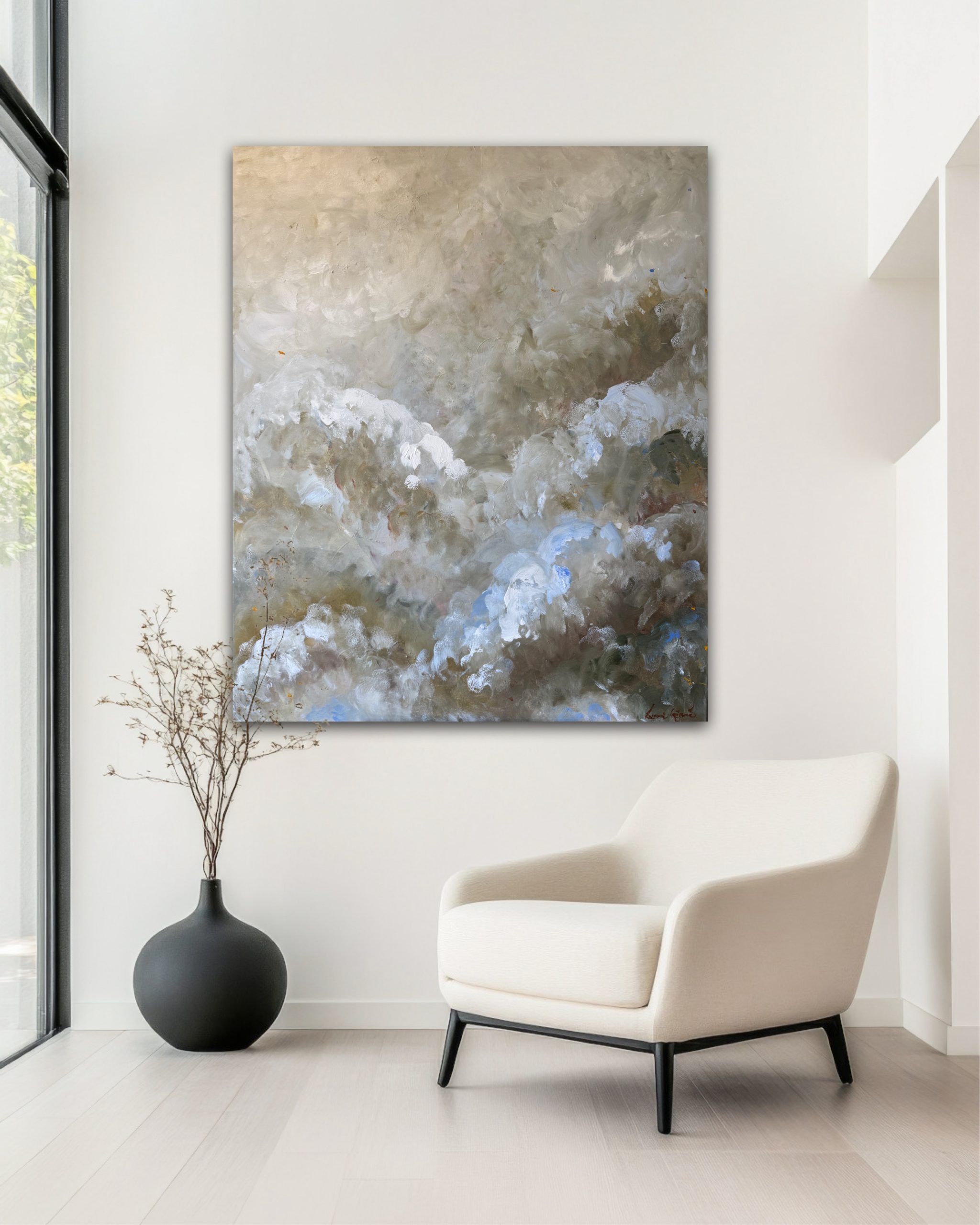 A gentle blend of soft neutrals, cool blues and earthy tones comes together in this serene abstract landscape. Inspired by the quiet movement of clouds and the texture of nature, this artwork evokes a feeling of calm and balance. It brings a sense of light, warmth and natural harmony to any space.