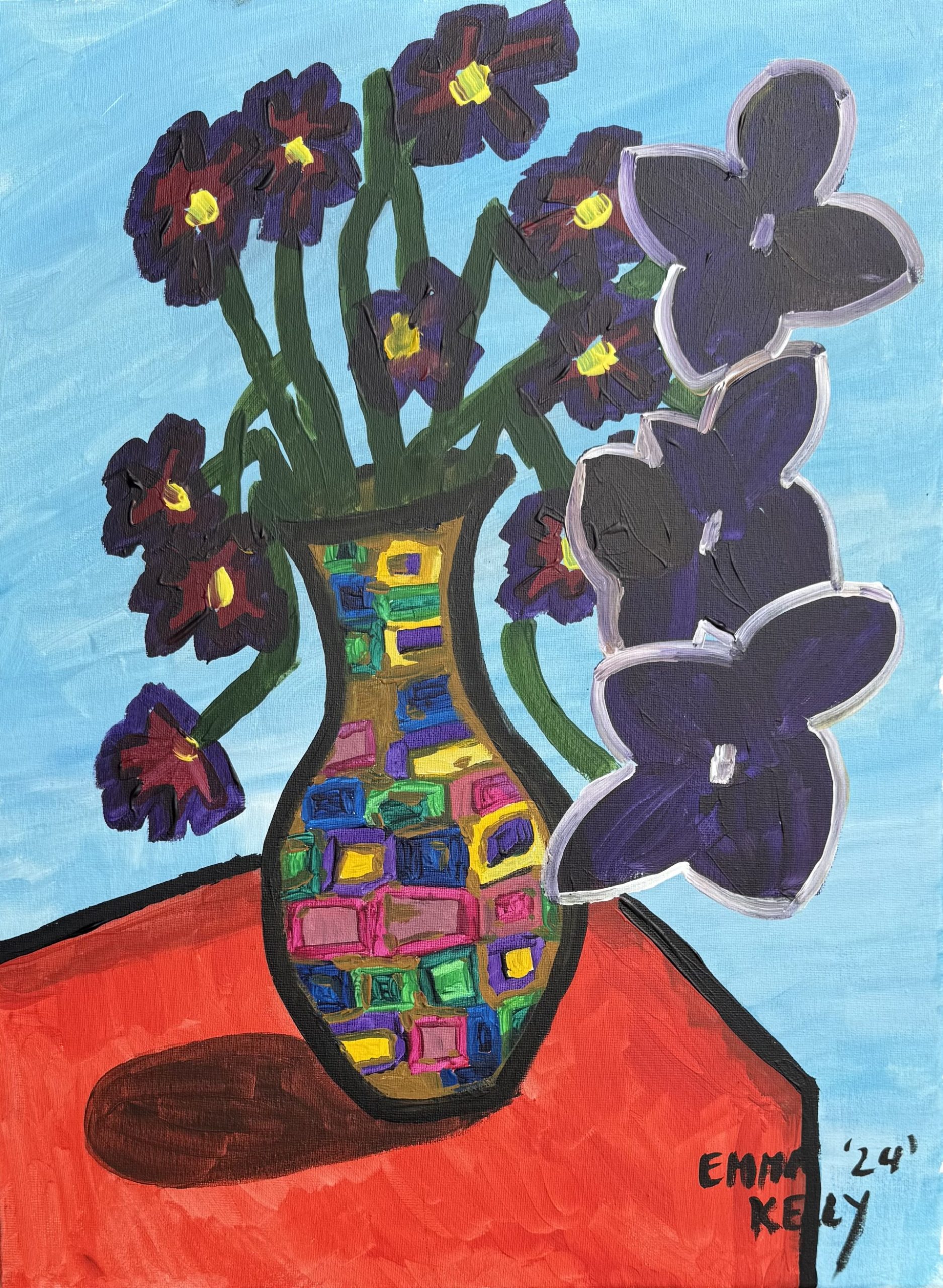 This artwork depicts many flowers in a vase with a bright blue background on a red-orange table. The positioning of the flowers in the painting are unique and bold. Purple flowers are outlined in white for contrast. Emma is heavily influenced by Margaret Preston who uses block prints for her work.