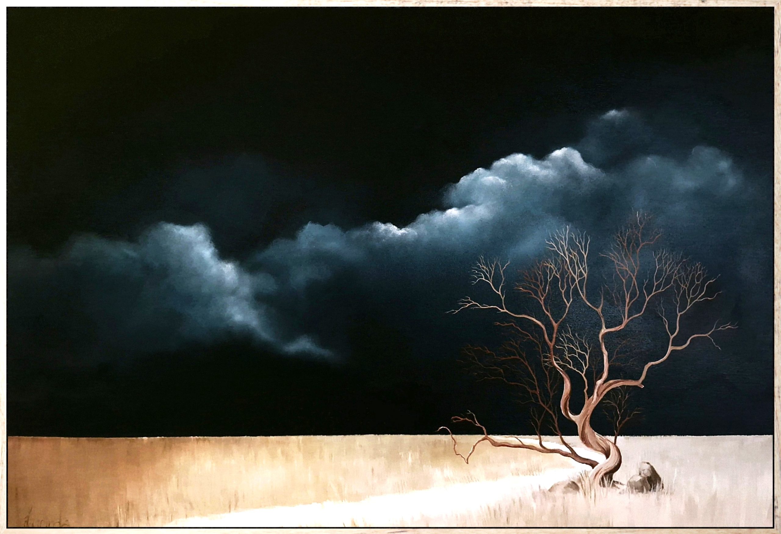 Still Standing is an evocative oil painting, the focal point an ancient tree, a weathered sentinel of the landscape that stands proudly in the foreground. Its gnarled branches reach skyward, each twist and turn telling a story of resilience and endurance. The bark shows the scars of time, cracked and rugged yet imbued with an almost palpable strength, symbolizing this tree’s ability to withstand the ravages of nature.