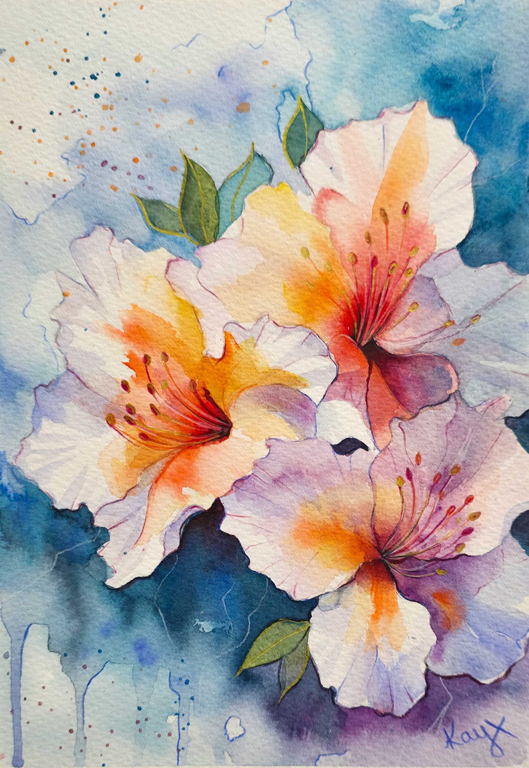 Still, the Azaleas Bloom by Kay Shanley  is a luminous watercolour celebrating quiet resilience and renewal. Soft layers of blush, coral and gold unfold against deep blue washes, allowing the azaleas to glow with gentle strength. This piece reflects the beauty that persists even in uncertain or shadowed moments — a reminder that growth continues, softly and steadily.