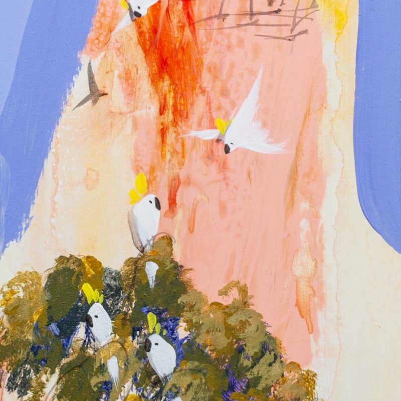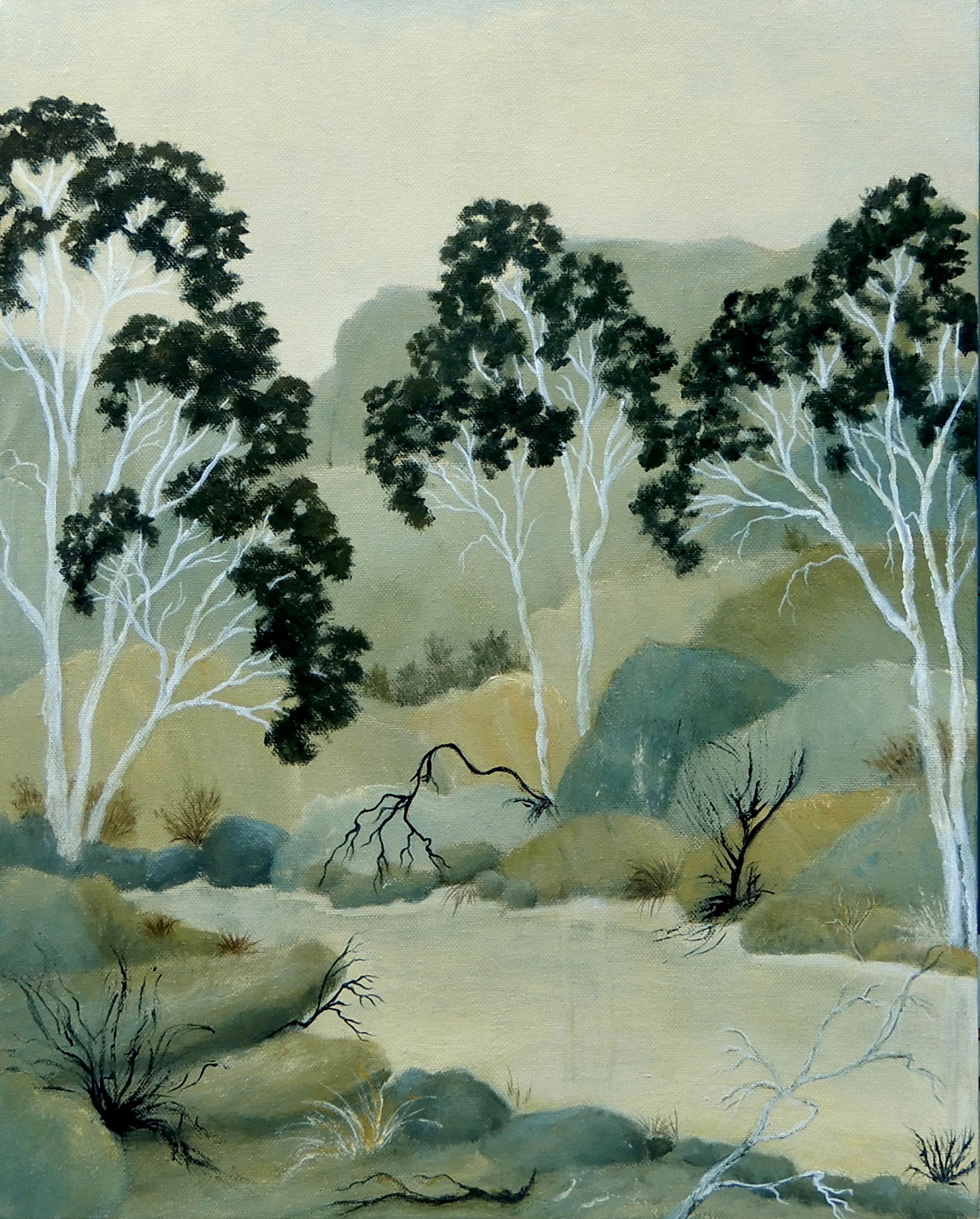Still waters in a WA creek under a pale sky, fringed by beautiful eucalypts. Painted with a limited palette that adds to the serenity of the artwork. Finished with two coats of varnish for protection.