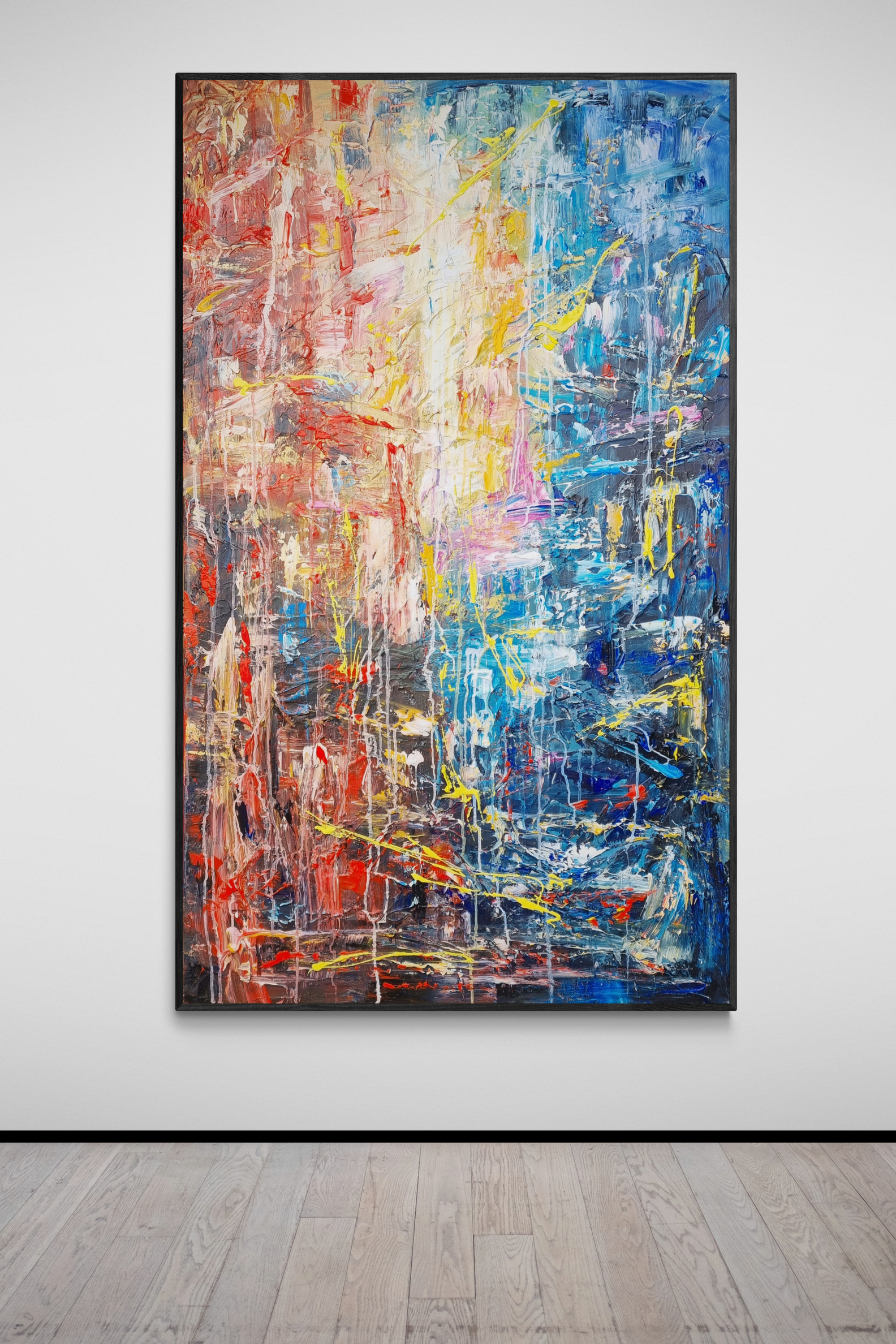 This beautiful modern piece is made with lots of layers and drips of acrylic paint. It was varnished for a protection of color. It has a wire at the back and is ready to hang. Signed with a certificate of authenticity.