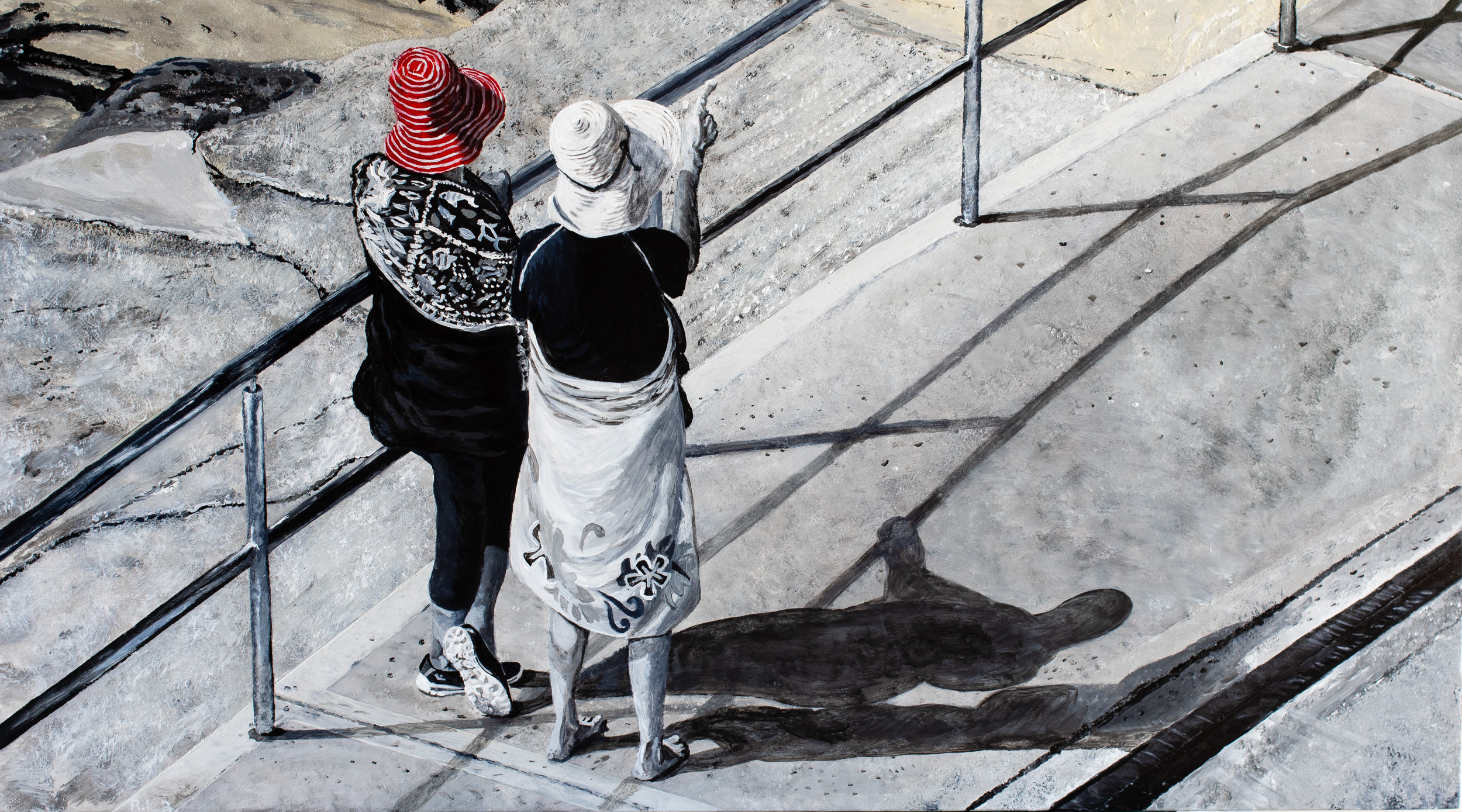 My favourite detail in this composition was painting the shadows cast on the cement walkway. I like how the ladies bent pointed finger casts a faint shadow above the cement join in the pavement. It seems that everything is pushing the viewers eye towards the unseen horizon.