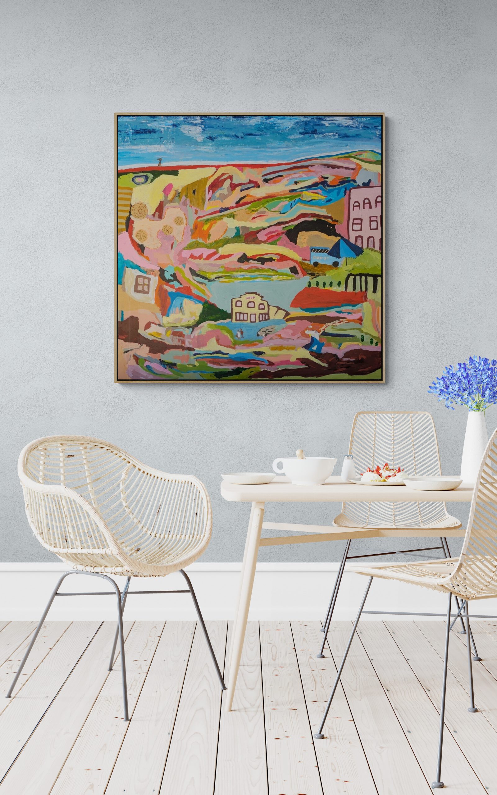 The artwork reflects her ongoing exploration of landscapes as emotional spaces: places that hold connection, belonging, and the beauty of lives intersecting. Through her abstract mapping of hills, water, and humble structures, she celebrates the resilience of simple communities and the inner world of memory that brightens them.