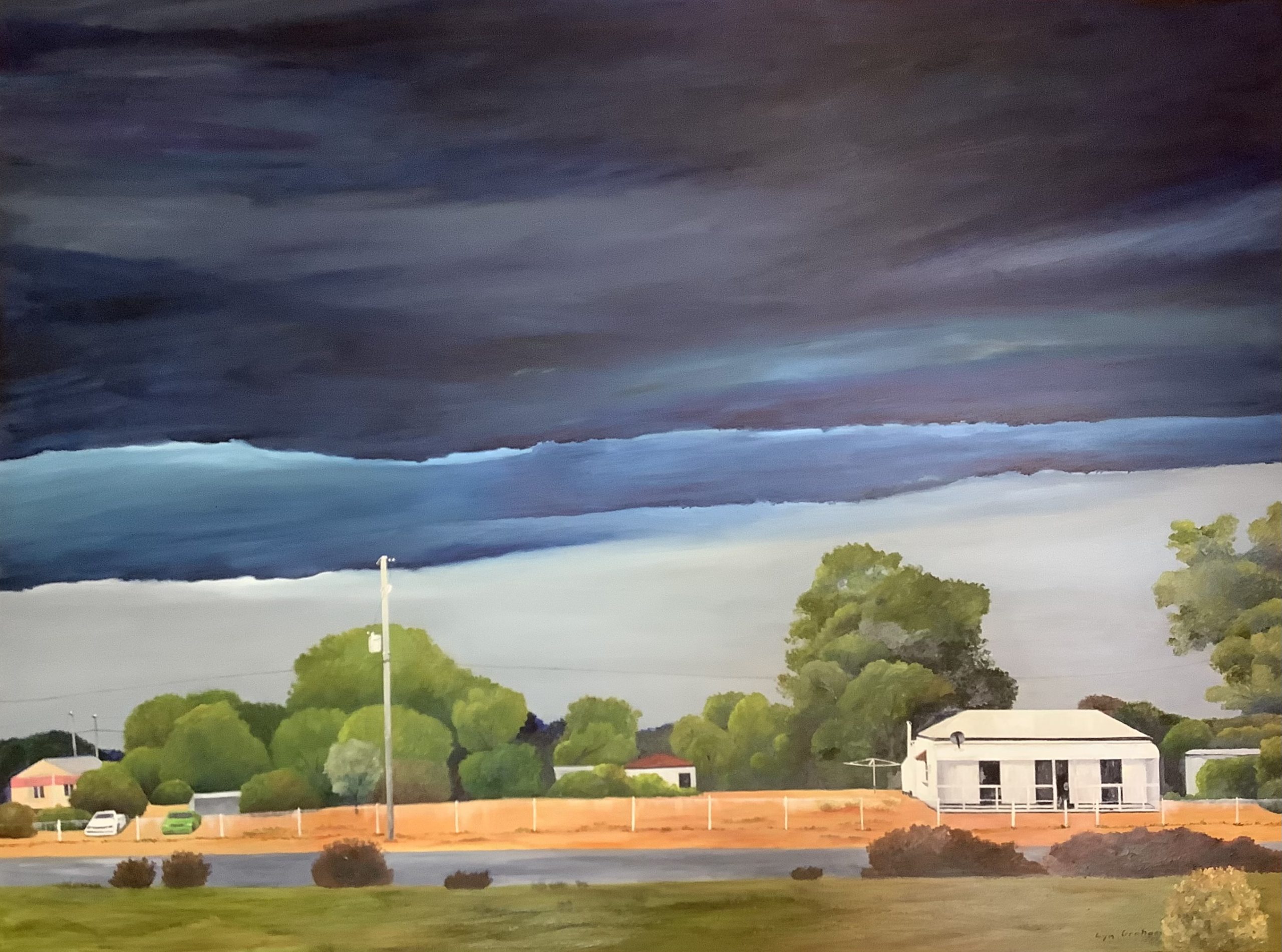 Storm Coming Cunnamulla by Lyn Graham – During the 2021 Covid lockdowns, I travelled 8,000 km through outback Queensland with my husband and fellow artist, Paul Rees. The Enormous Vastness series is inspired by the beauty of the landscapes we saw.