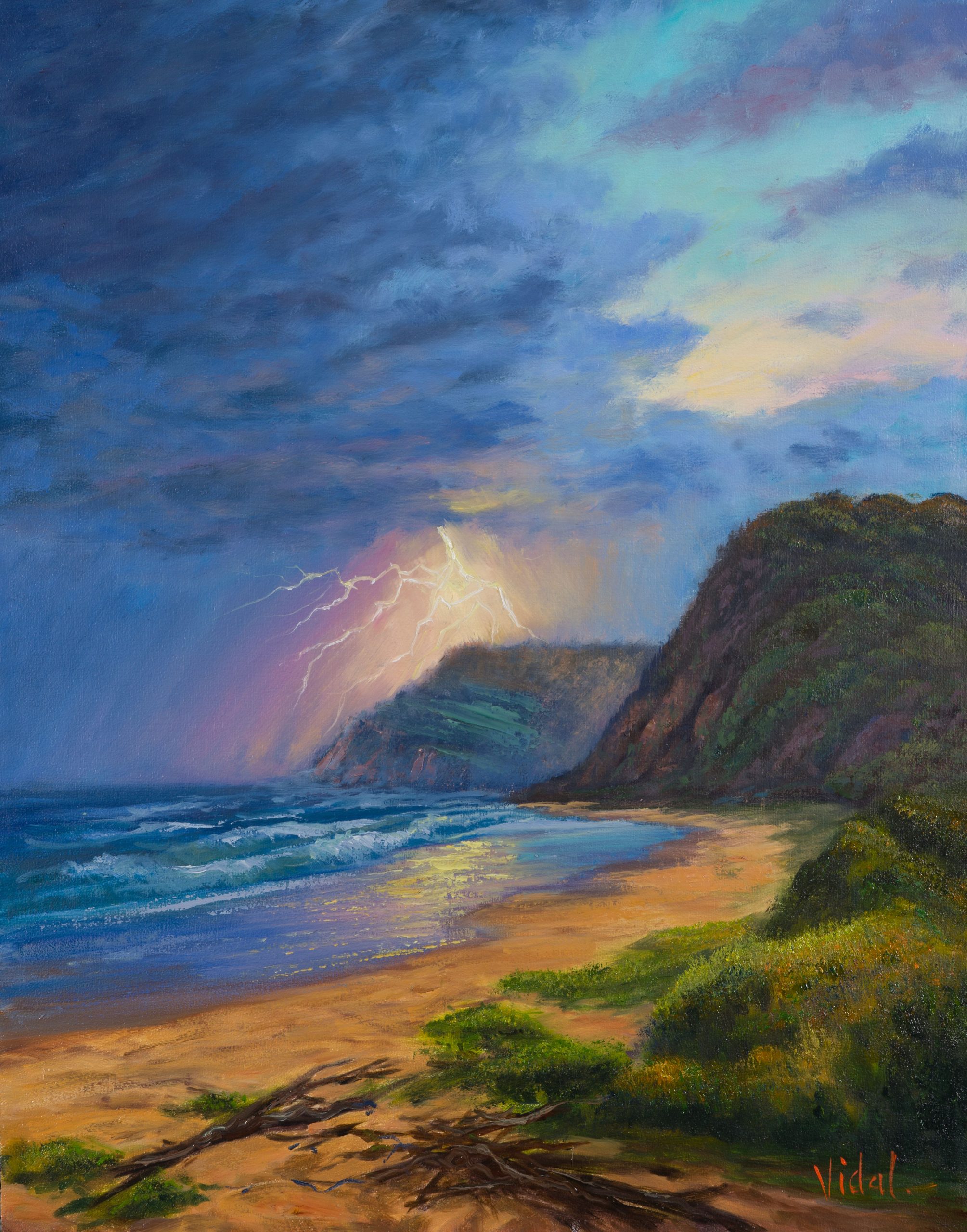 Capturing the energy and intensity of lightning adds an exciting element to the artwork. It requires careful observation of the unique characteristics of lightning, such as its brightness, movement, and atmospheric effects. This painting was inspired by my visit to Garie beach a few years ago.