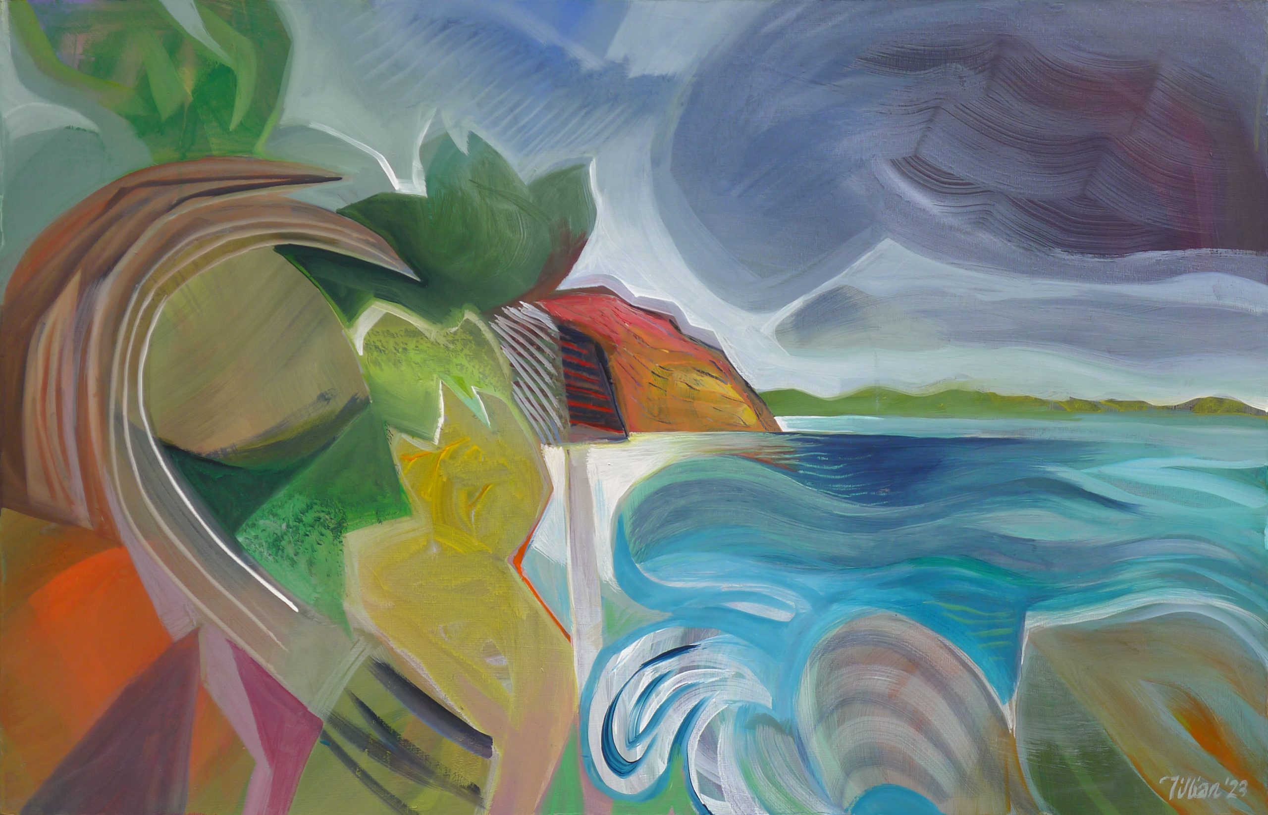 In this sweeping coastal abstraction, I evoke the raw tension between land and sea, atmosphere and psyche. The rocky escarpment bisecting the canvas acts as both geological and emotional threshold, while storm clouds churn above a sea rendered in fluid, calligraphic strokes. The stormfront itself is delicately modulated: hues of indigo, gunmetal grey, and violet arc in upper-right whorls, suggesting both atmospheric momentum and psychic turbulence. In the foreground, the sea is both object and energy, articulated through ribbons and eddies of aquamarine and turquoise, sweeping leftward in an almost calligraphic manner. This ambiguity is crucial: the sea’s motion seems to reach back toward the land, not only physically but metaphorically, as if invoking ancestral memory or mythic recursion.