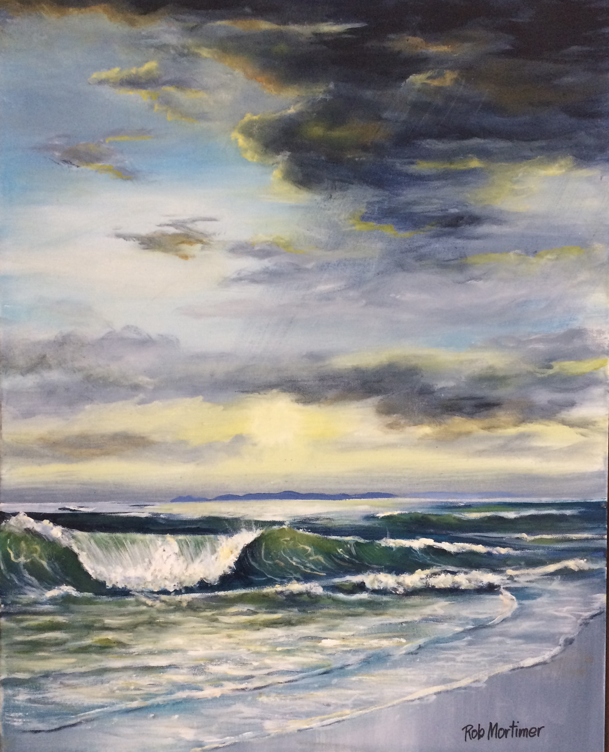 Original seascape on quality stretched canvas, clear coated with wire and D hooks and felt pads at back