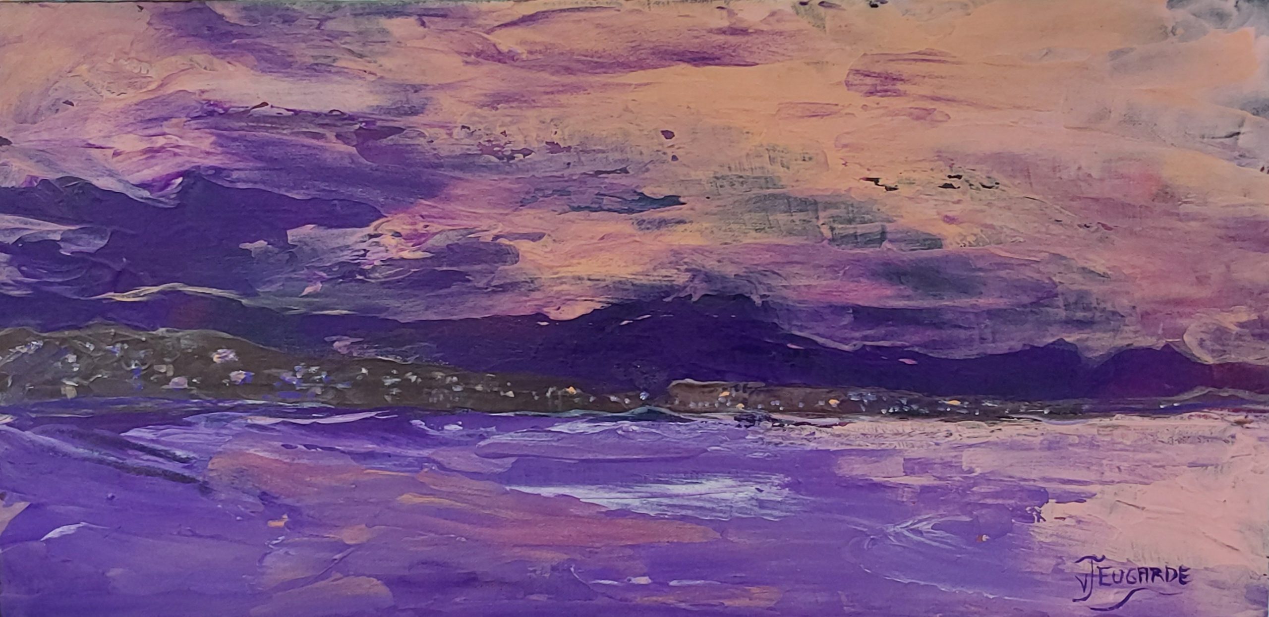 Stormy Bay by Valerie Eugarde:- This abstracted seascape was inspired by the rough and windy weather that has whipped the normally calm seas into a choppy bay, the evening is closing in and heavenly shadows deepen towards the end of day.