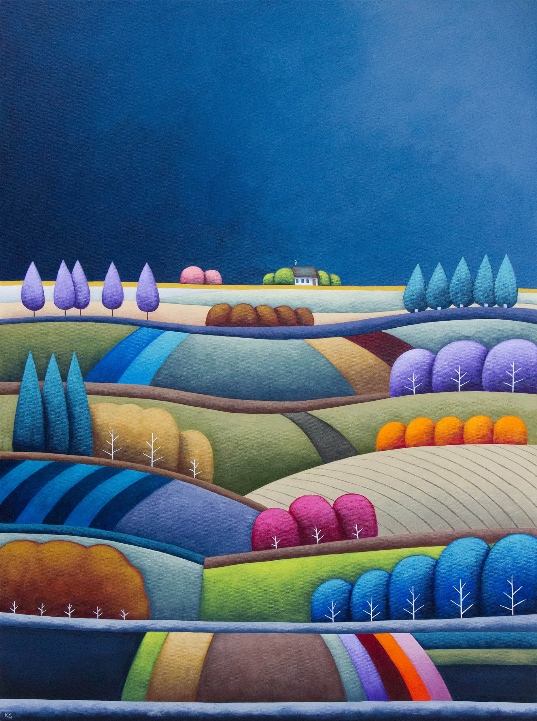 This dramatic, stormy nighttime semi-abstract landscape is composed of a patchwork of neutral and cooler-coloured fields and stripes with pops of pink, yellow and orange interspersed throughout. A house sits on the horizon amongst a line of trees. Painted in a naive style to bring a sense of charm and delight, painted with dry-brush effect to give it a textured feel. The flattened perspective gives the composition a naive and whimsical feel. This piece would make a striking addition to an art collection, displayed at home or office, bedroom or living room.