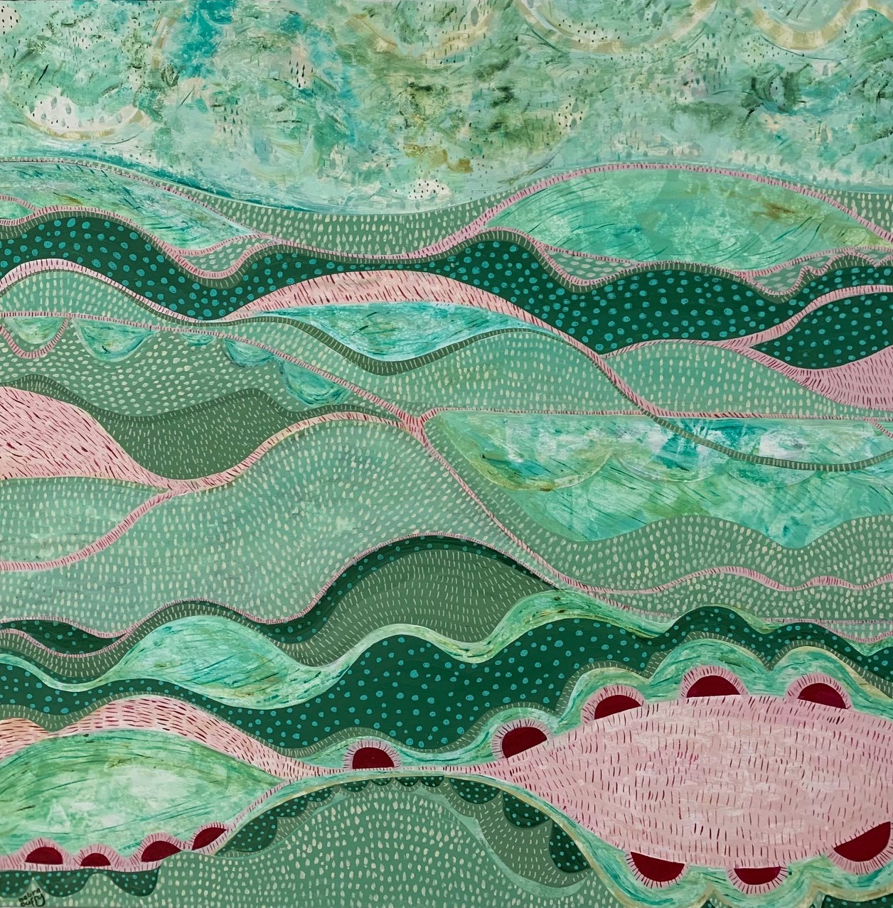 This artwork is an original abstract using acrylic paint and artist markers. This abstract landscape was inspired by the colours of pink and crimson and I wanted to incorporate these into this artwork combining them with using intricate detailed lines and patterns suggesting subtle textures and movement.