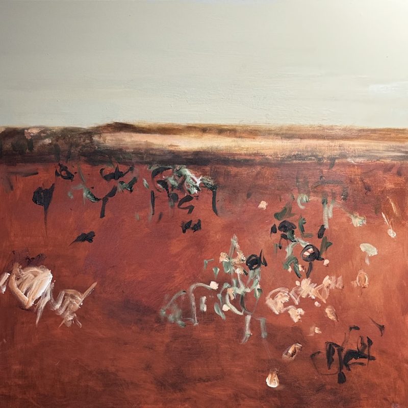 Another self-portrait, this painting has a soft but striking presence. The girl’s direct gaze feels calm and unguarded, while the lamb in her arms adds a sense of innocence and quiet trust. The background – a wash of teal, mint, and rose tones – is dotted with floating strawberries, which gives the whole scene a touch of surreal whimsy without breaking its gentle mood. I painted this after moving back to “the country” after a 30-year absence – I find myself once again surrounded by bleating sheep – something I never would have guessed would happen!
