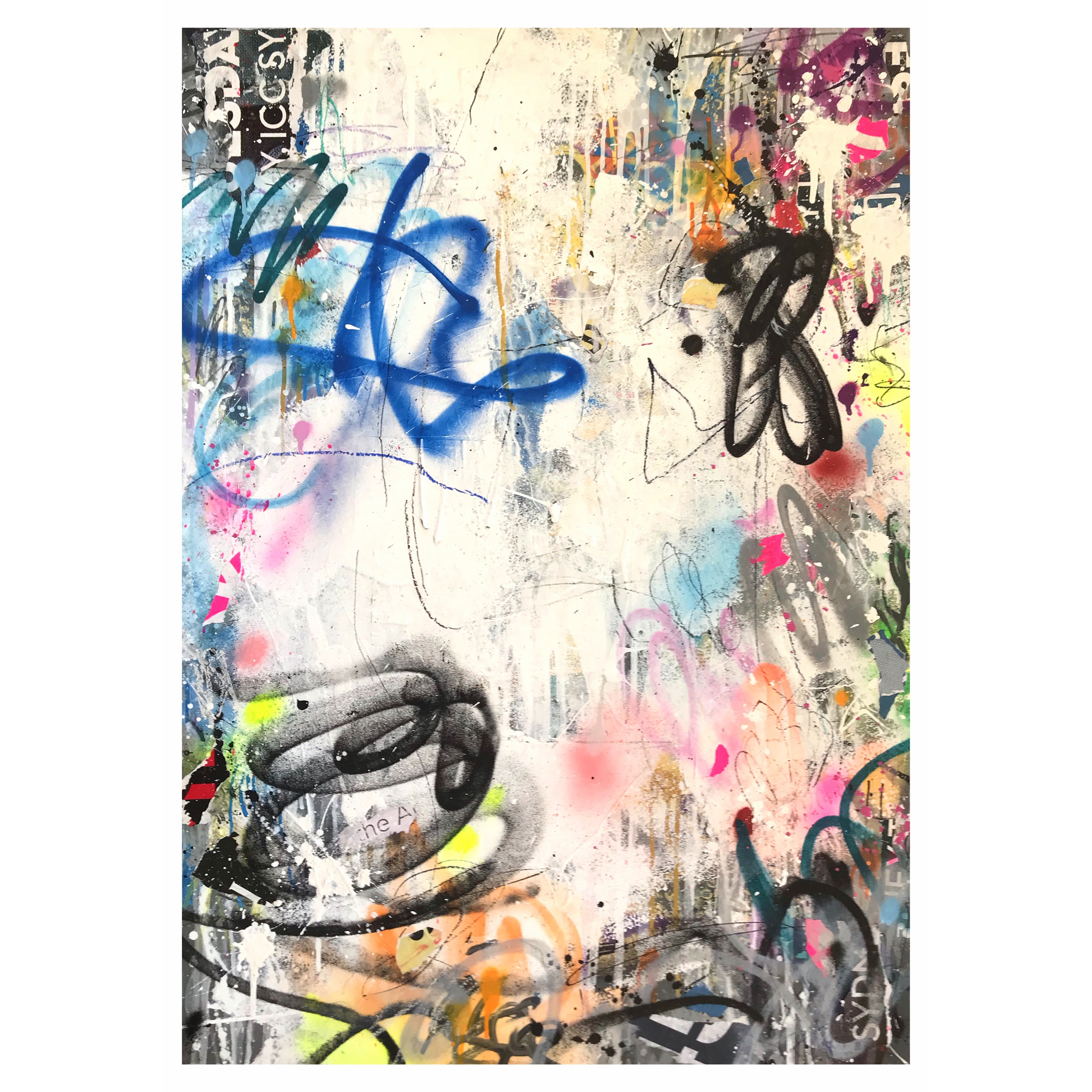 This artwork has a textured finish created by built up layers, paint splatters and torn paper, a visual effect mimicking the look you would see in the street where this effect is created over time on Graffiti Walls & Advertising Spaces. These imperfections are part of the overall look and feel of the finished work.