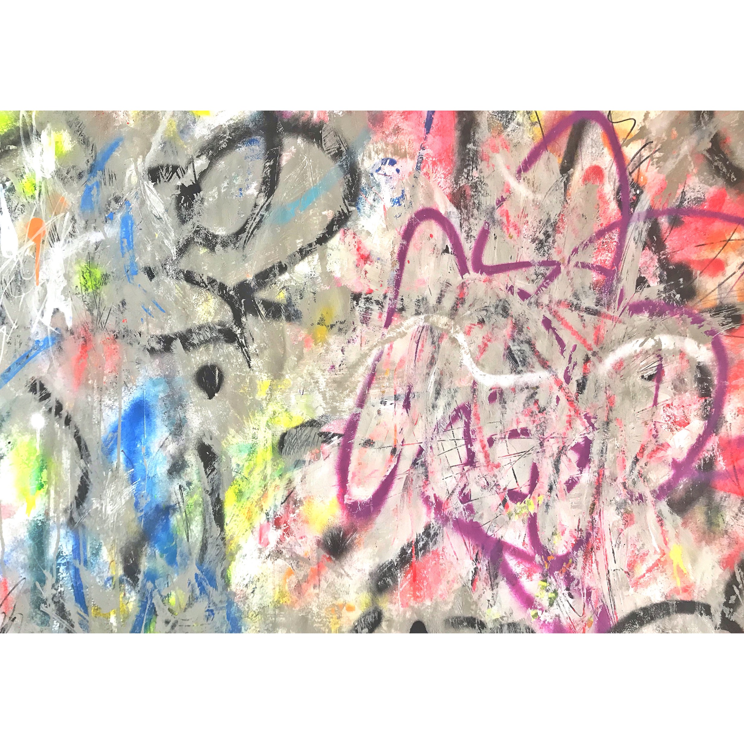 The painting surface has multiple layers of paint with subtle hits of Acrylic Paint to give it a rustic look, like an organic build up of street paint layers. Then overlapping Sugar Spray Packs & graffiti Paint Pens. I allow the revealing coloured layers then to influence the colour palette, in this case warm hues of Pink, Purple & Orange with hits of grey and teal.