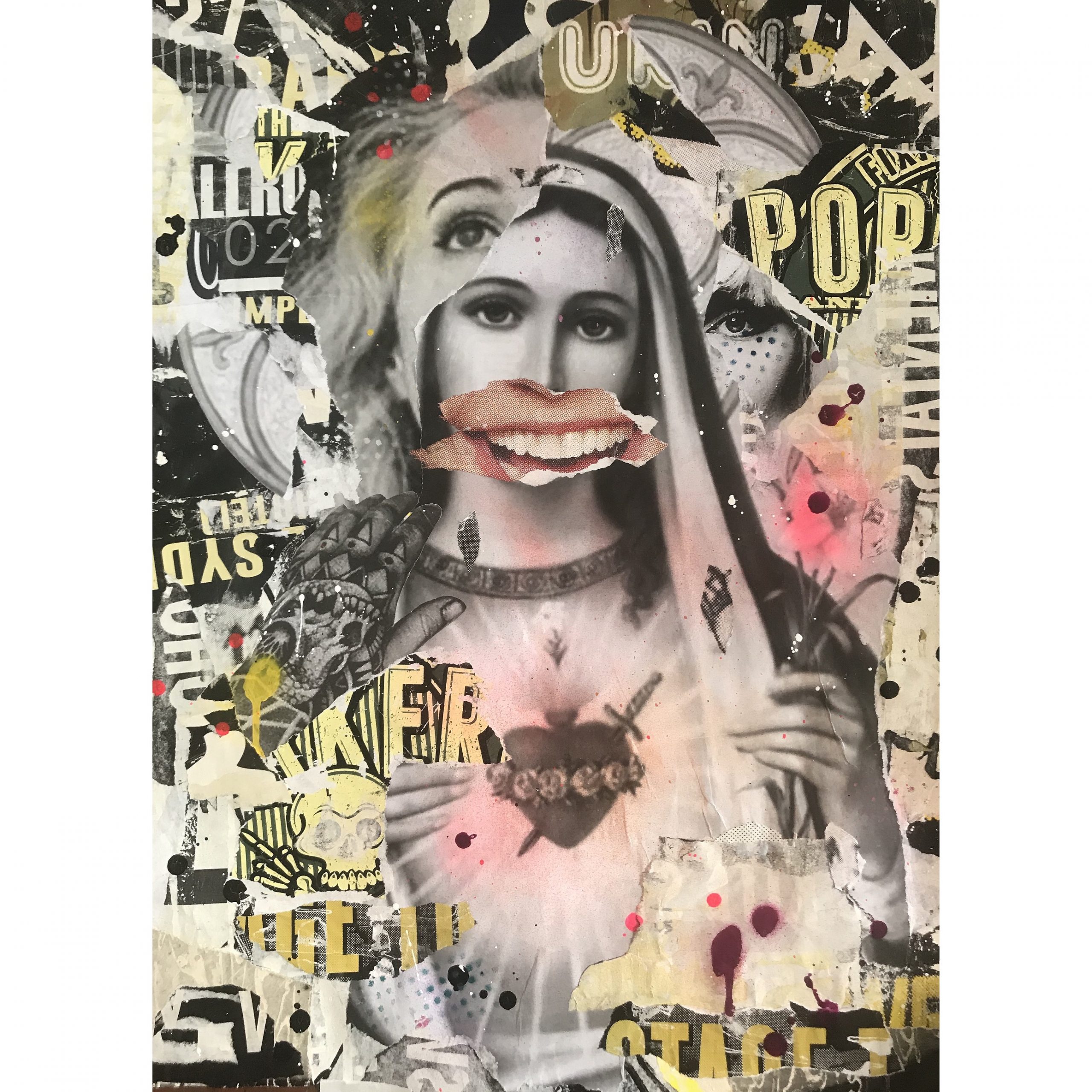 The main collage was built up with vintage  posters collected off the streets of both Sydney & Melbourne. This background was then overlayed with Acrylic Paint, Sugar Spray Packs, Stencils, Paint Pens and Pencils.