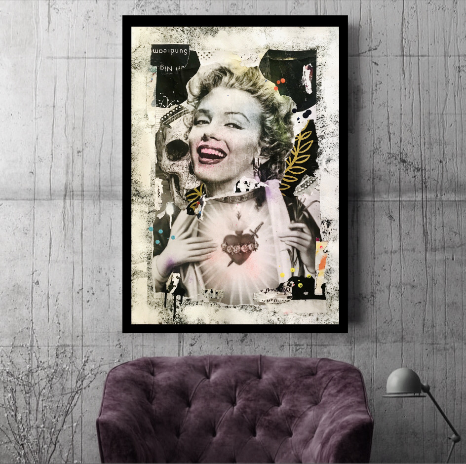 Then the main Image of a Madonna/Marilyn, was then added and further overlaid with a recycled paper and paint to give the image a worn rustic appearance.