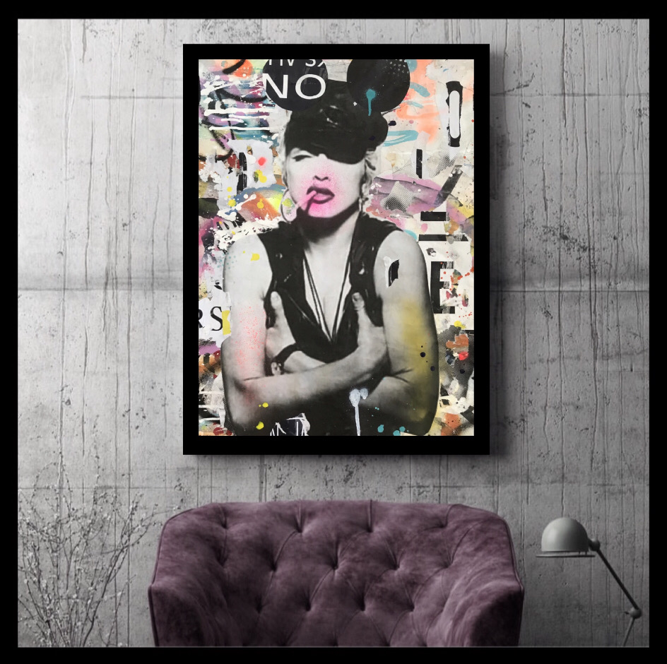 This artwork has a textured finish created by built up layers, paint splatters and torn paper, a visual effect mimicking the look you would see in the street where this effect is created over time. These imperfections are part of the overall look and feel of the finished work.