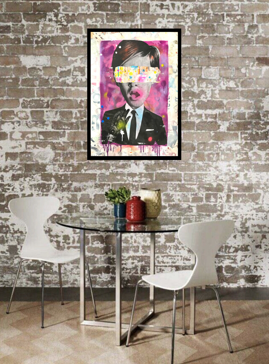 This artwork has a textured finish created by built up layers, paint splatters and torn paper, a visual effect mimicking the look you would see in the street where this effect is created over time. These imperfections are part of the overall look and feel of the finished work.