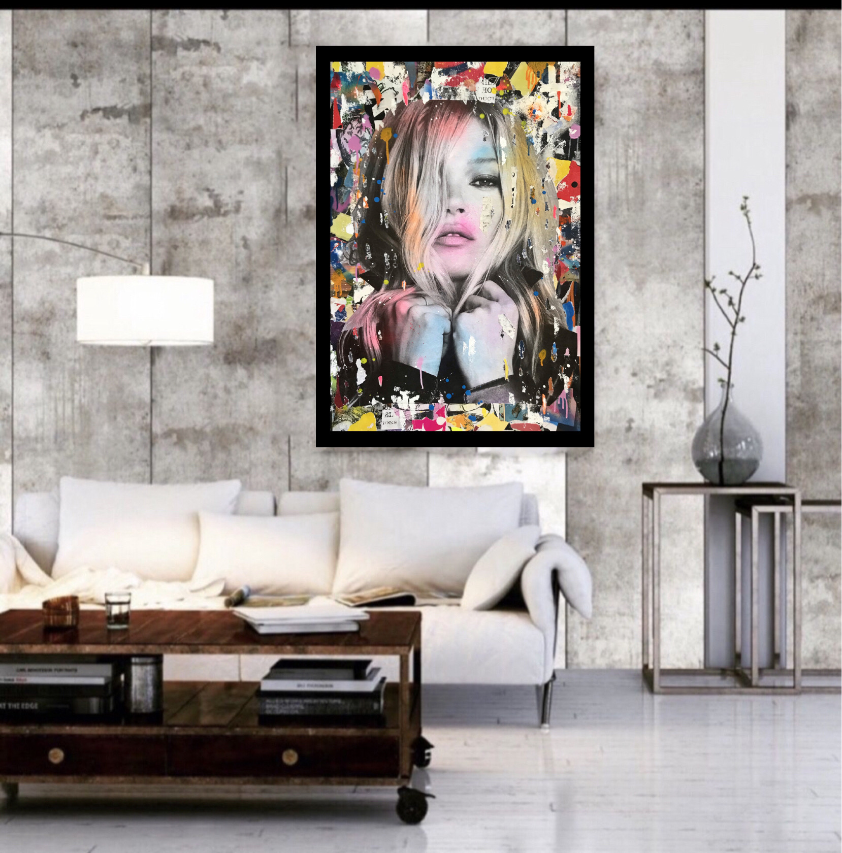The main image of Kate Moss was then added and further overlaid with paper and paint to give a worn rustic appearance.