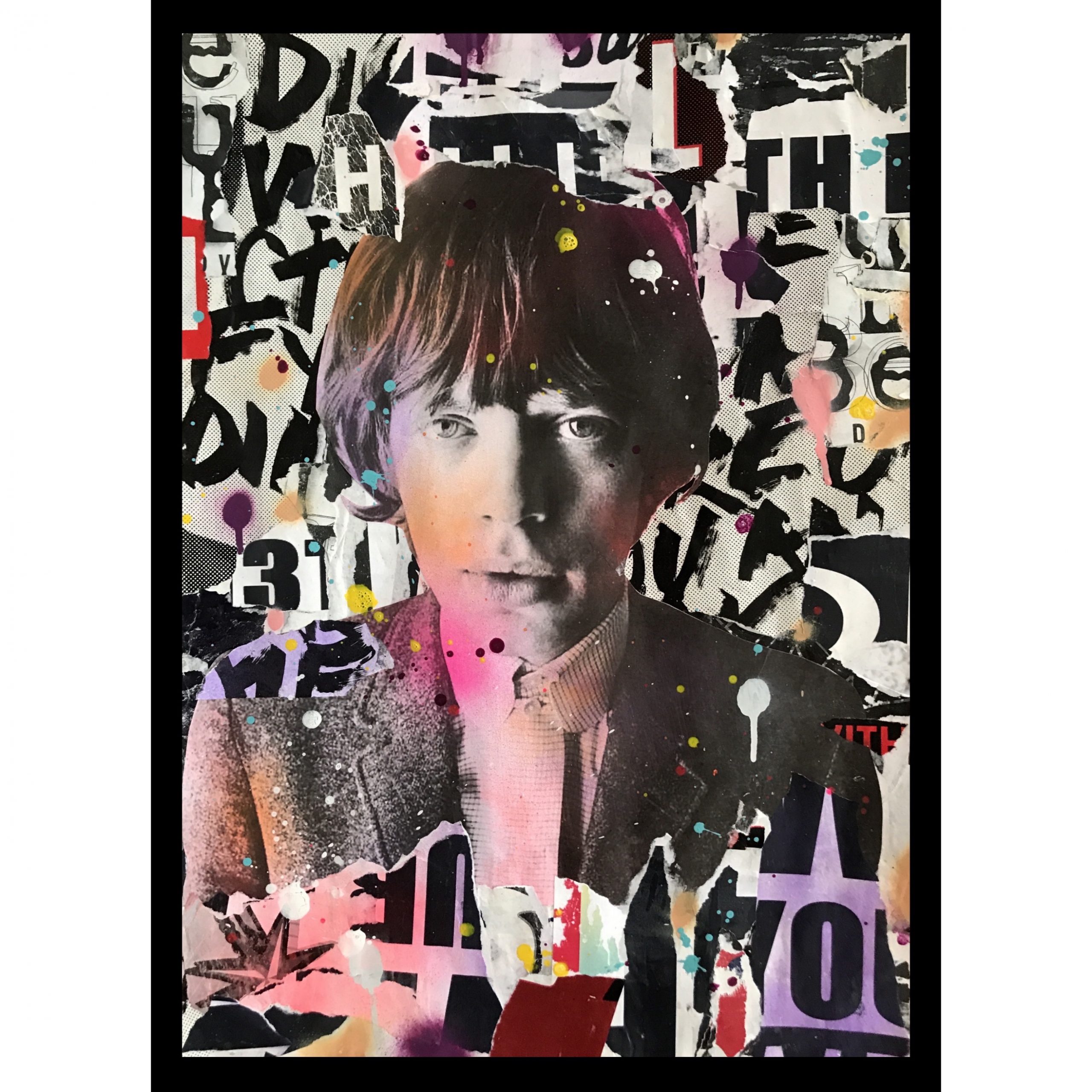The main vintage image of Mick Jagger was added and overlaid further with paint and paper to give a worn rustic appearance.