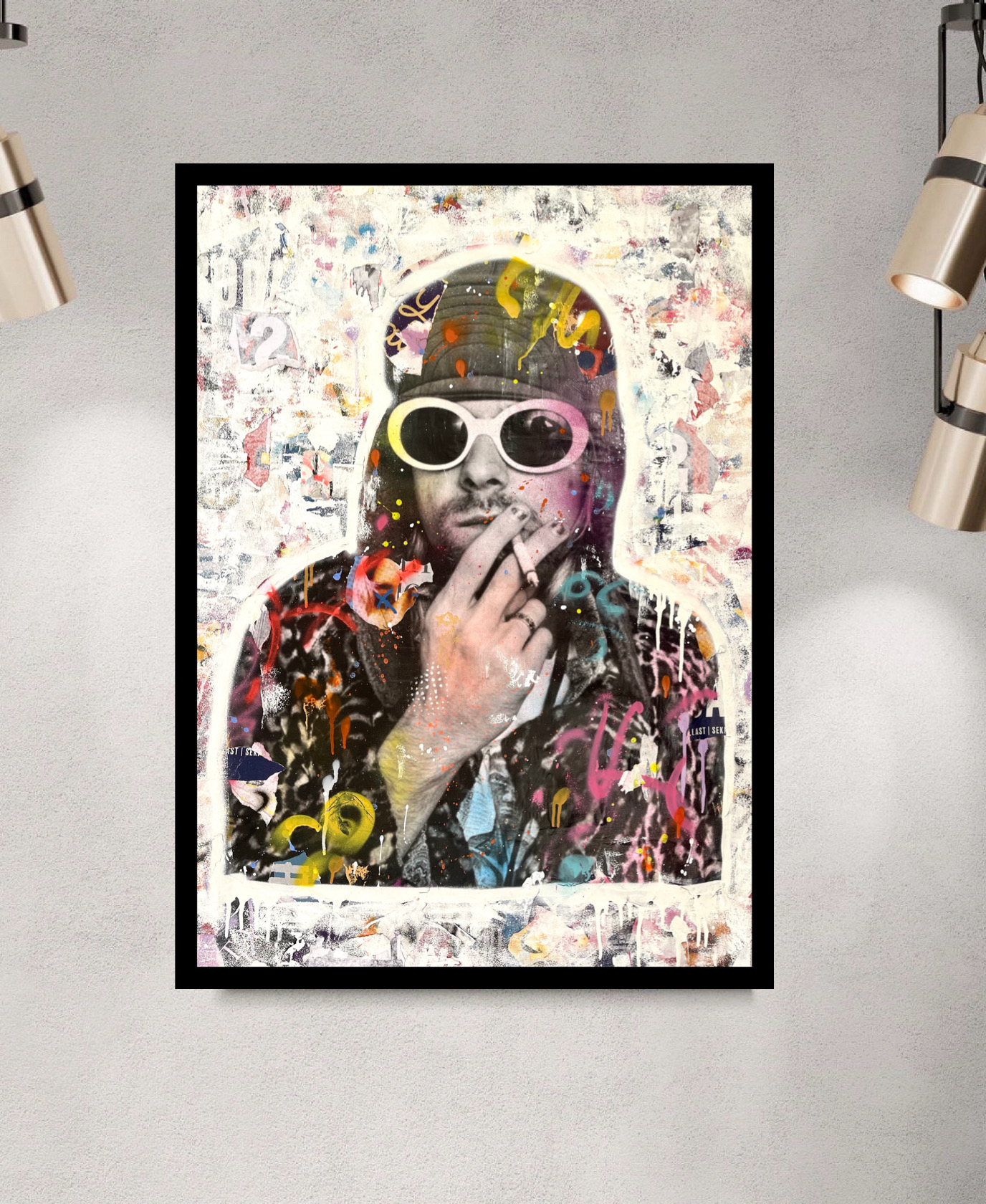 The main Image of Kurt was added and then further overlaid with lots of layers of paint and street posters to give a worn rustic appearance.