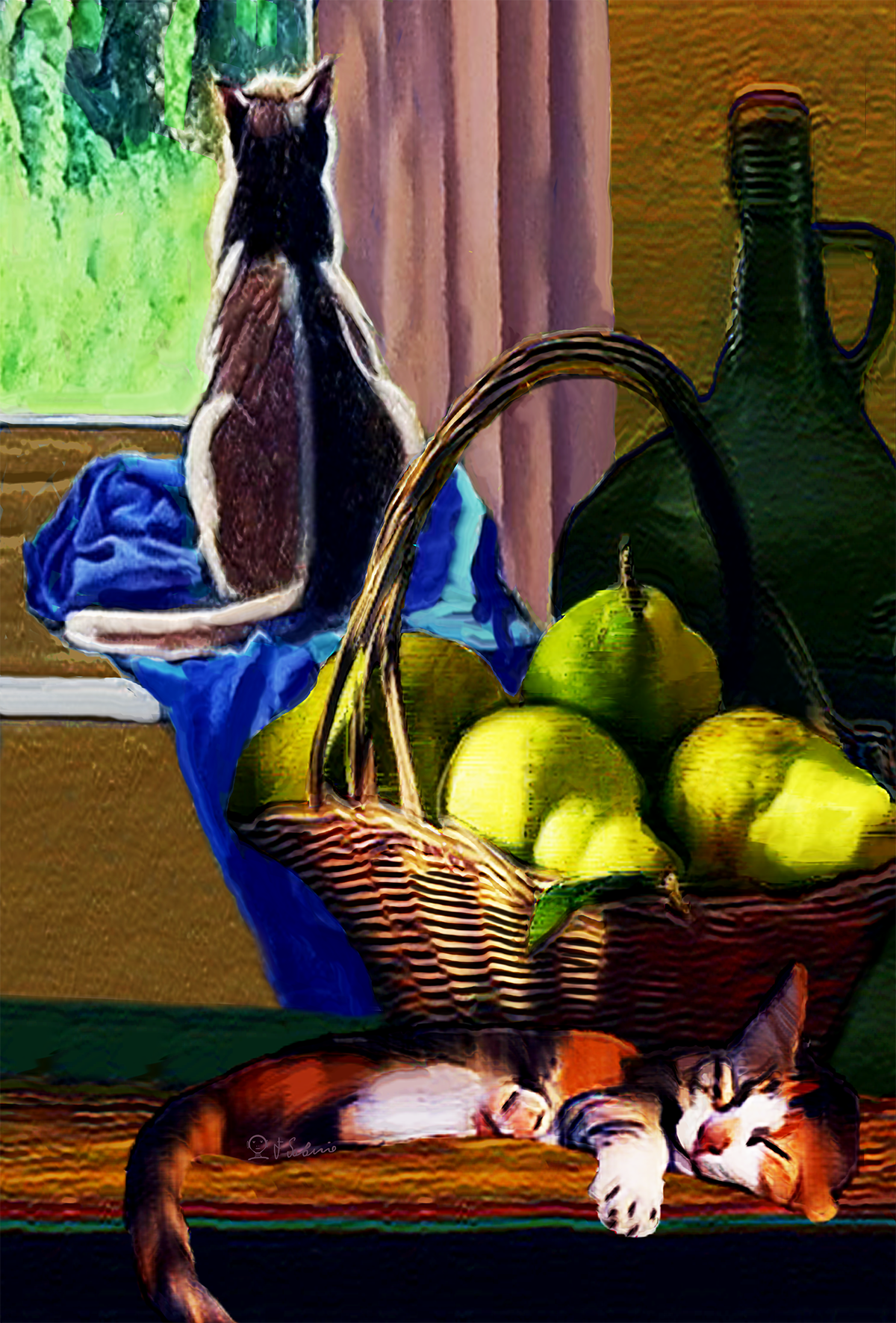 This image is an digital painting titled “two cats, and a basket of fruit, ” by Francesco Sobrio.