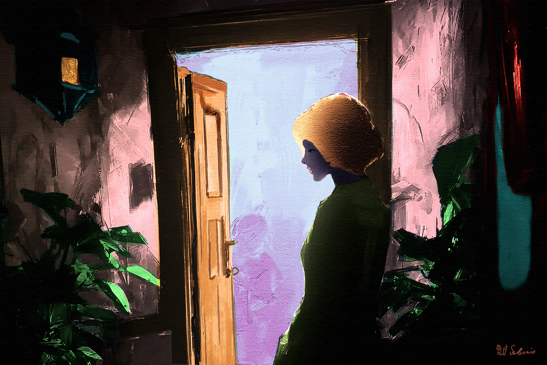 A person with blonde hair is depicted in profile, looking out of a brightly lit doorway into a purple-hued space.