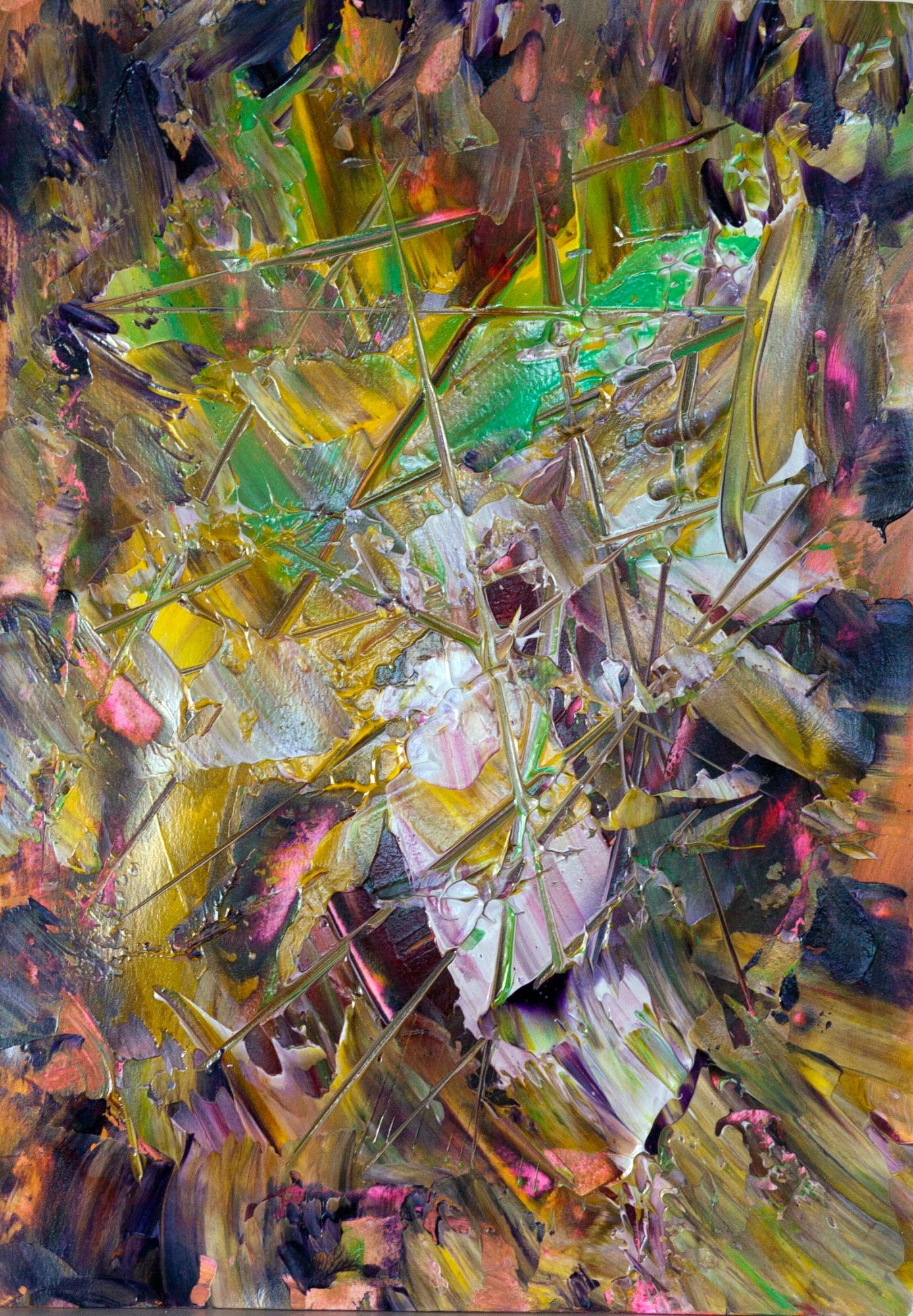 The idea behind this abstract is cosmic strings, from the physics of string theory. Cosmic strings are very large and are believed to cross large sections across many galaxies. While abstract, there is a subtle geometry about strings as well. This artwork is in the style of abstract expressionism.