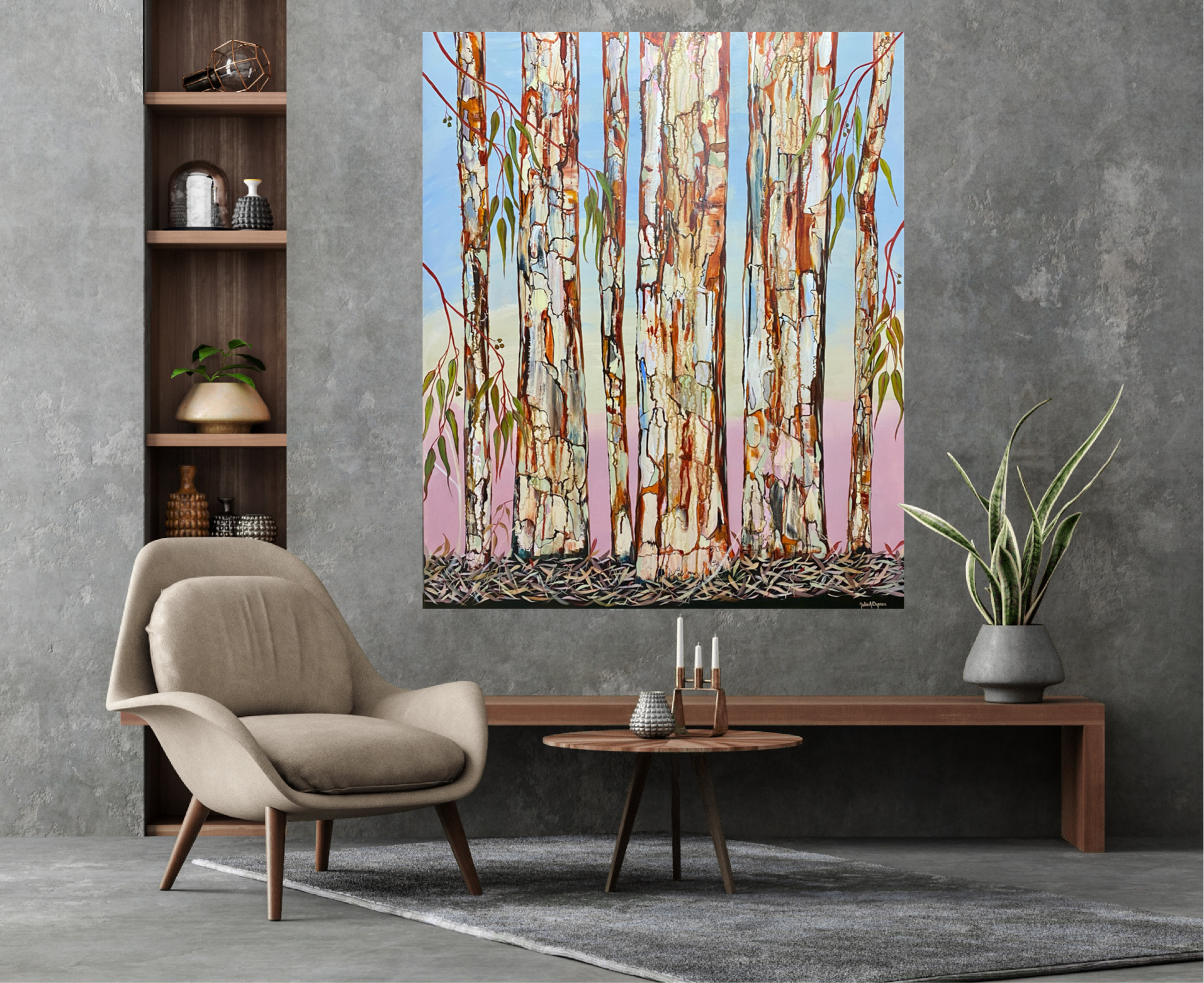 Strong and Tall’ by Julie Dynan an original acrylic artwork which has colourful bark with lots of detail, gum leaves on branches with dried leaves and twigs on the forest floor.